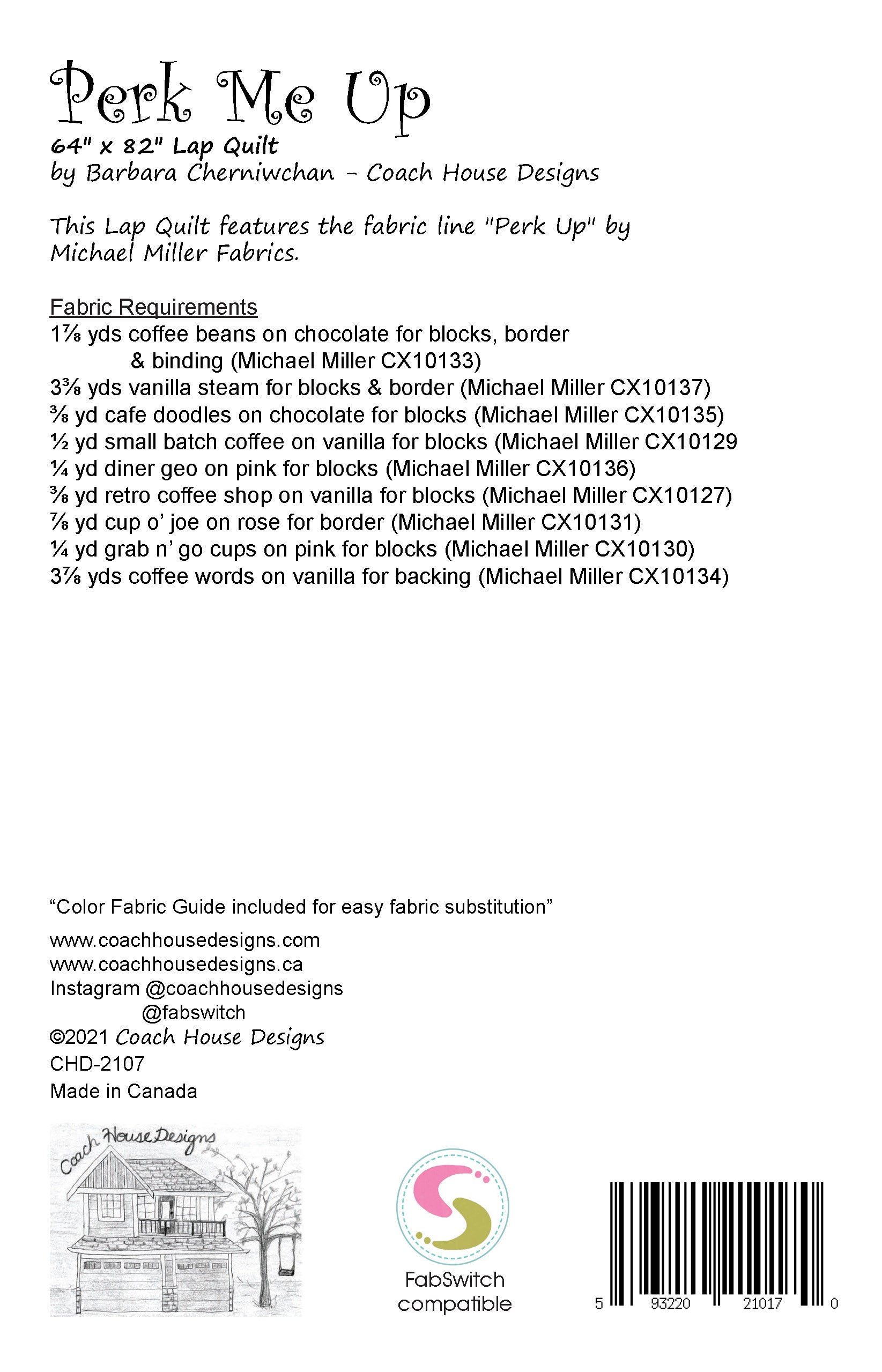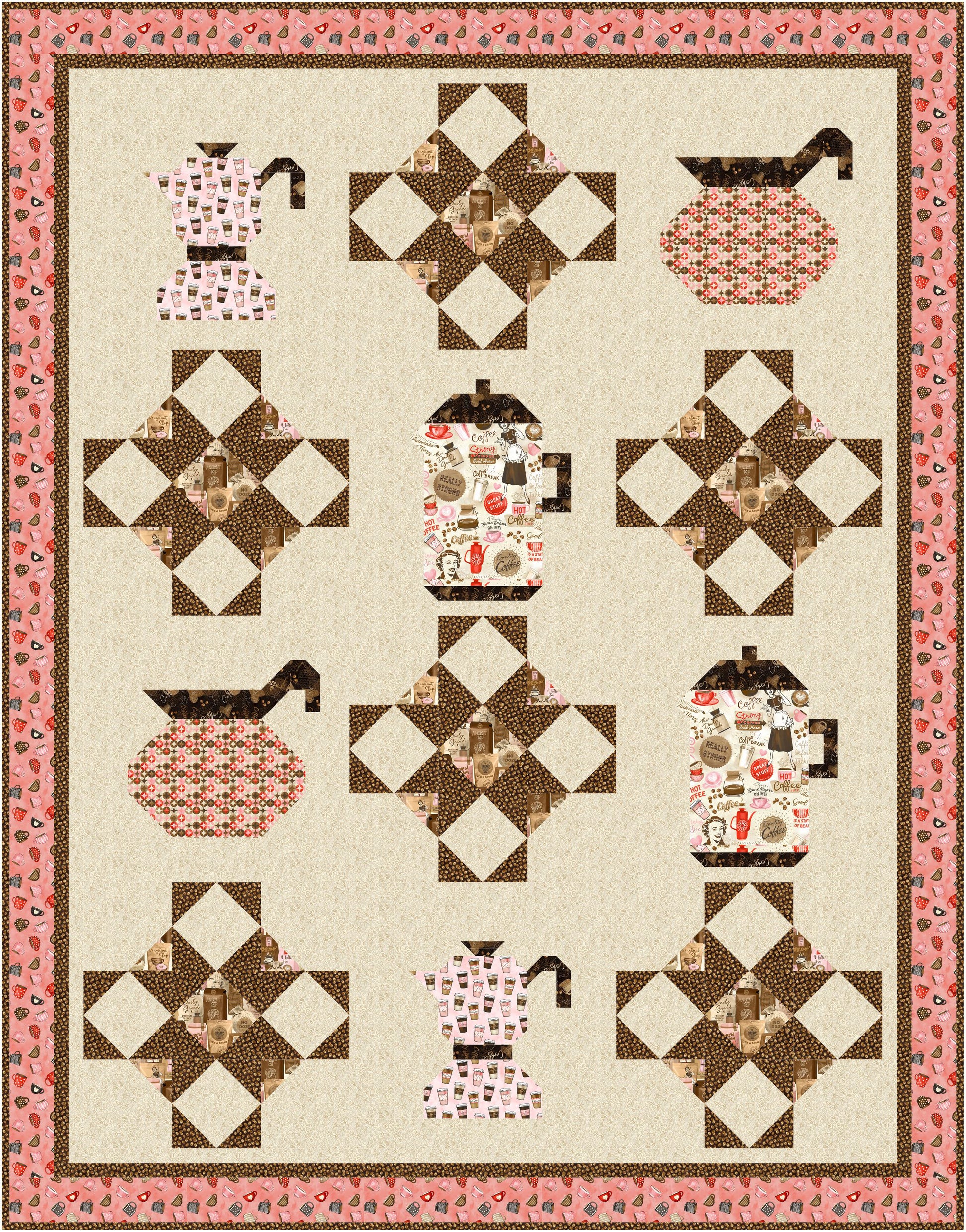 This 64" x 82" lap quilt features the fabric line "Perk Up" by Michael Miller Fabrics and is a re-coloration of Always Coffee First. Gotta love this cute pink and brown retro fabric! Fabric will be in stores in Summer 2021.