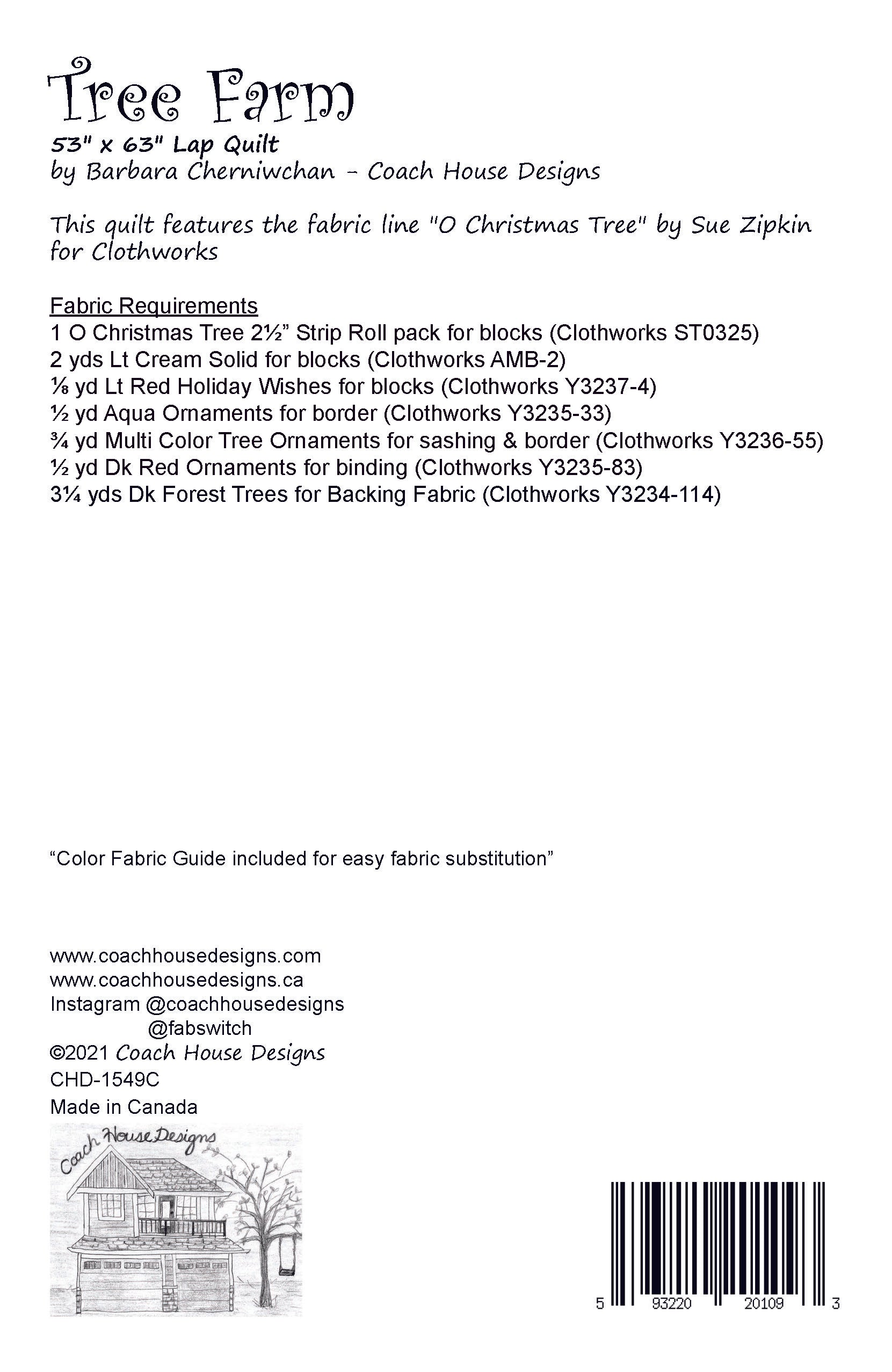 This pattern is a re-colored version of Tree Farm featuring "O Christmas Tree" by Sue Zipkin for Clothworks. Lap quilt is 53" x 63" and uses a 2 1/2" Strip Roll. Fabric will be in stores May 2021.