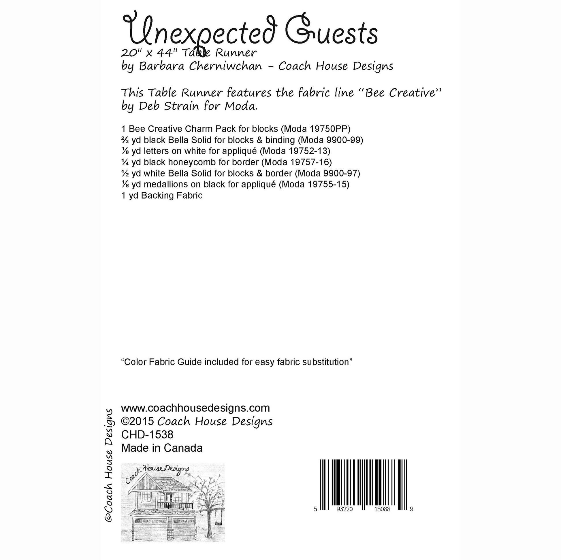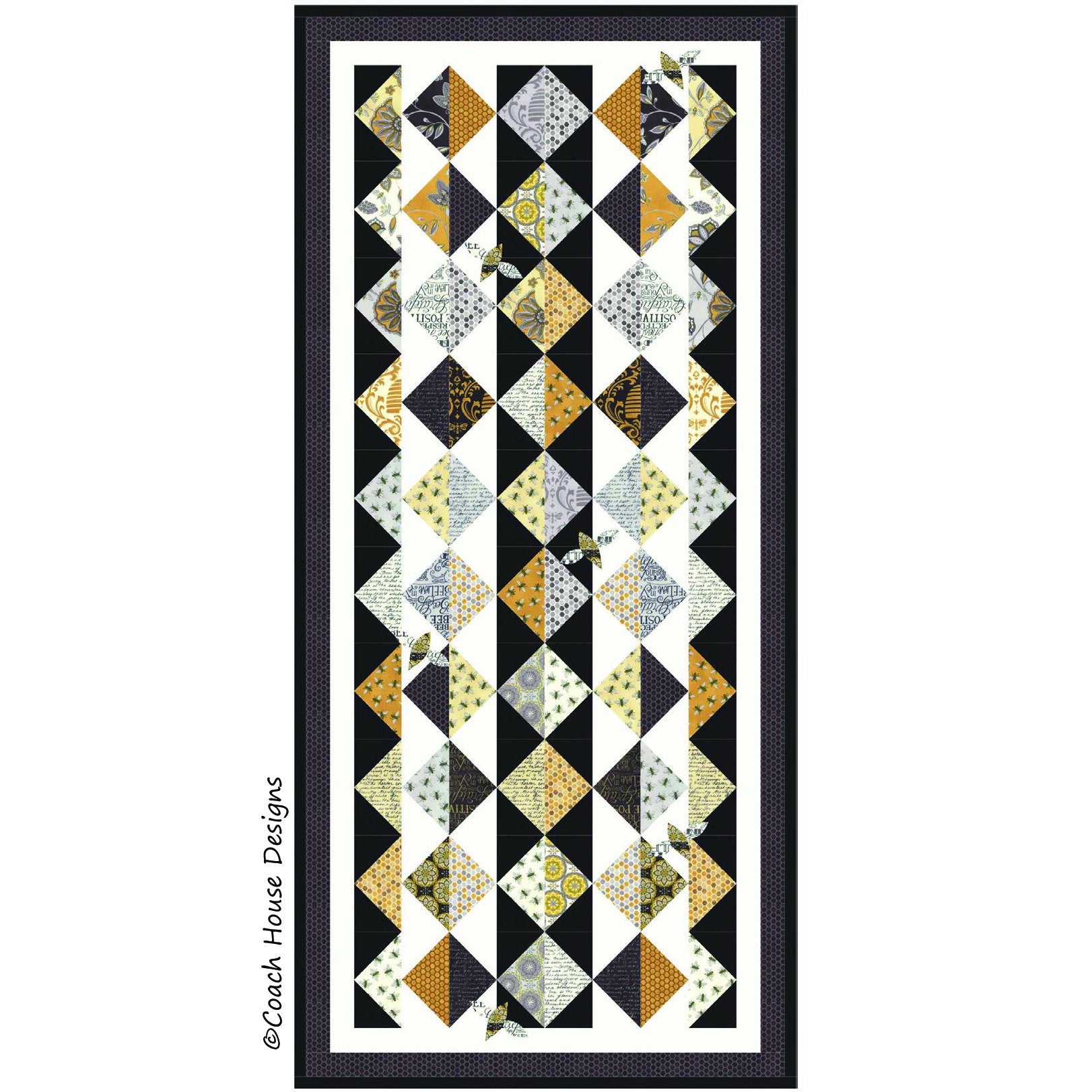This cute runner measures 20" x 44" and uses a charm square pack. It is shown in "Bee Creative" by Deb Strain which was released in 2016. It would look cute in any fabric!