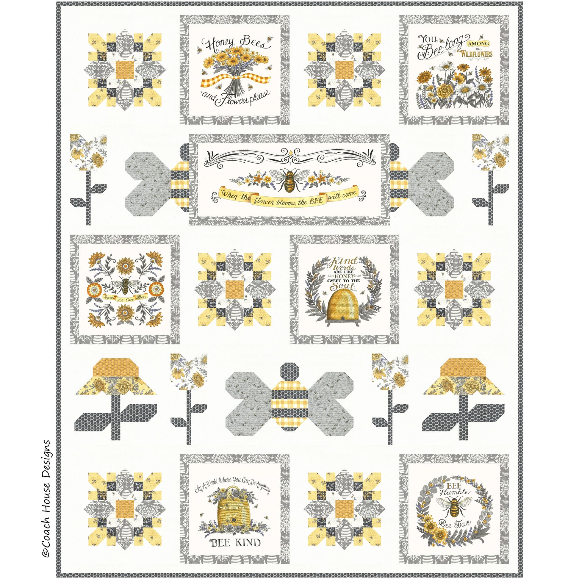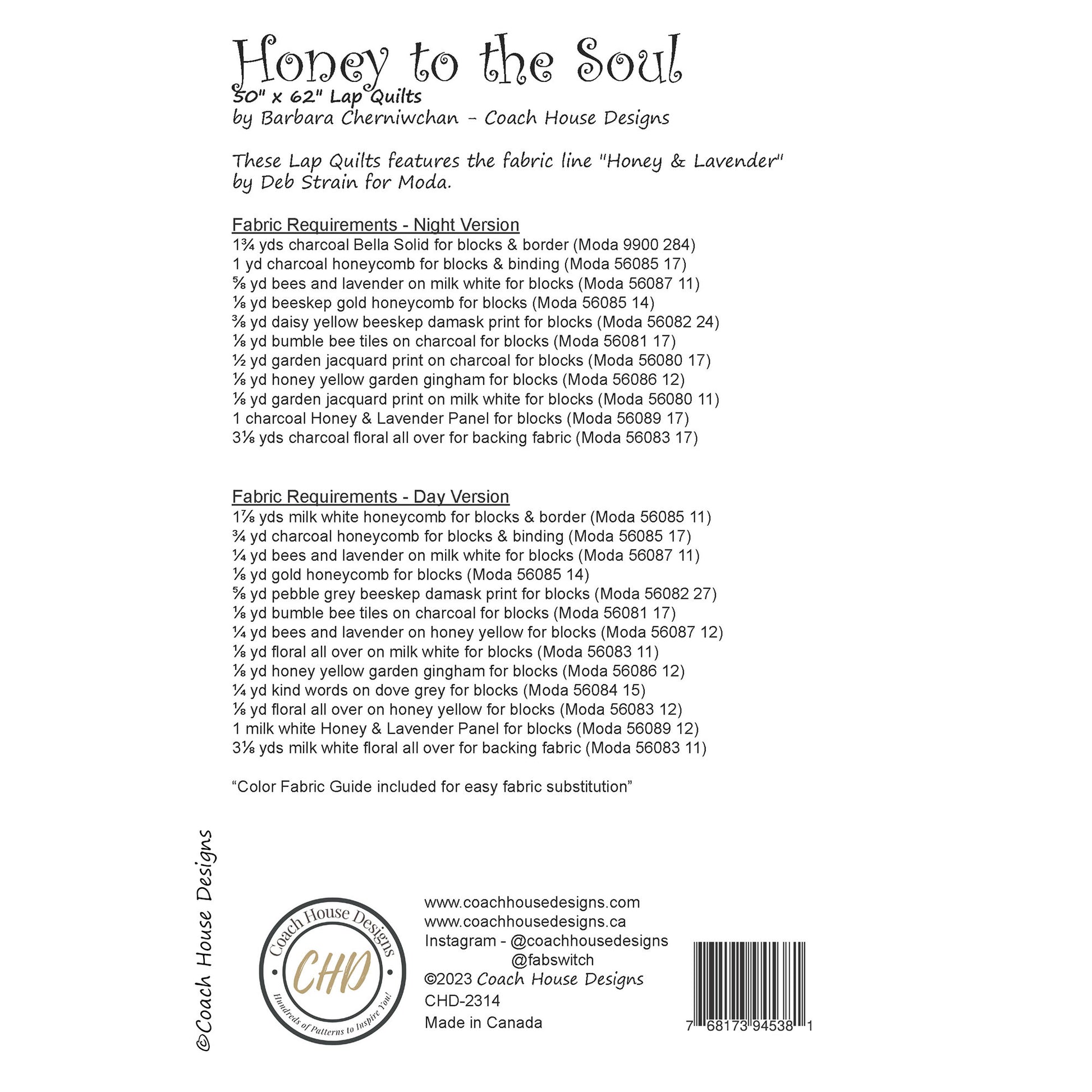 Measuring a cozy 50" x 62", the pattern is a homage to the captivating world of bees and the luscious sweetness of honey. It uses the fabric line and panels from "Honey and Lavender" by Deb Strain for Moda Fabrics. Patterns include instructions for both a dark night version and a bright day version. Nestled among the bees are an array of vibrant flowers, adding bursts of color and enchantment to the quilt. These floral accents create a beautiful contrast against the soothing lavender panels, showcasing the attention to detail found in Deb Strain's beloved "Honey and Lavender" fabric collection.