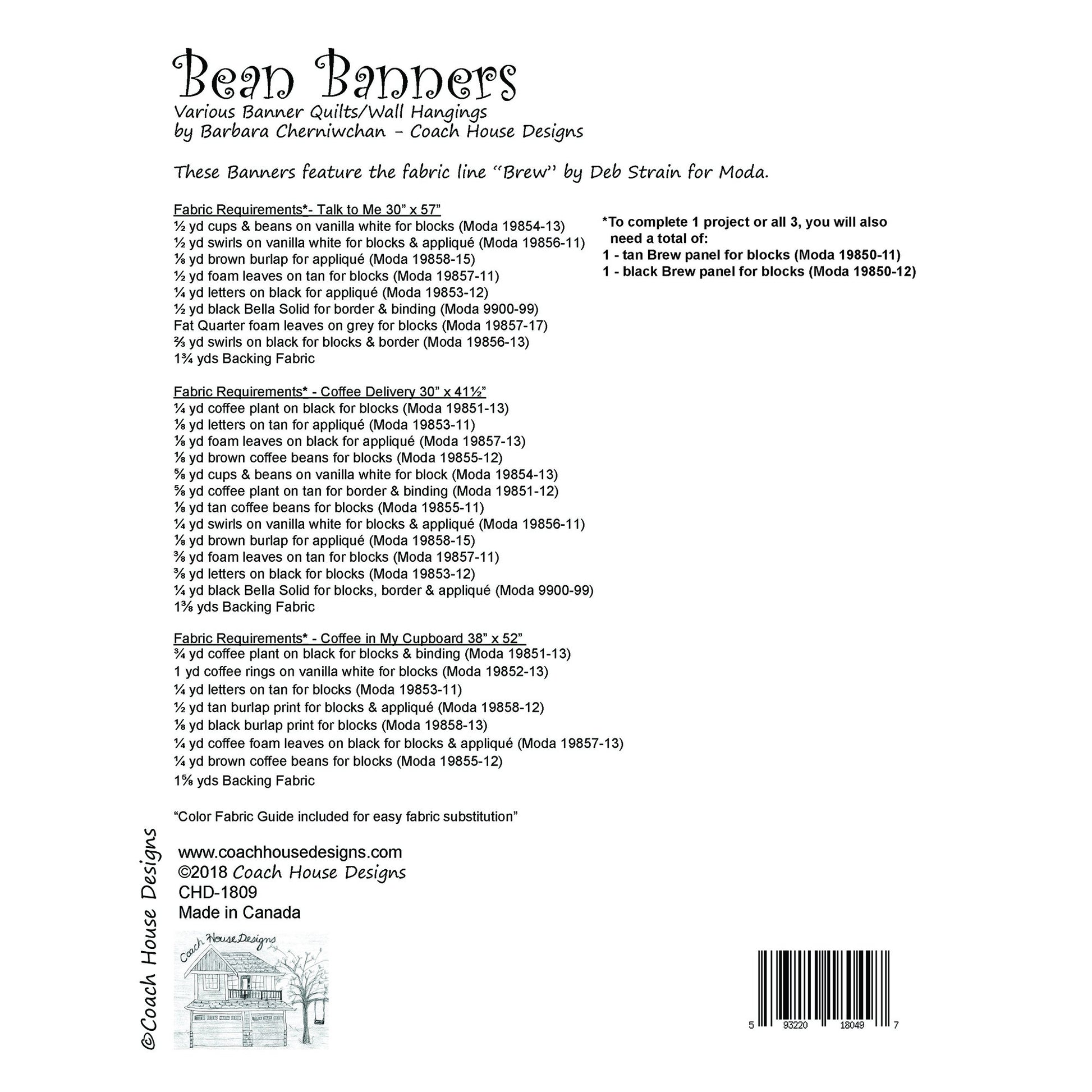 This pattern includes instructions for 3 coffee themed wall quilts with mostly piecing and some applique. Each of the projects use Deb Strain's "Brew" panel. The wall quilts measure as follows: Coffee in My Cupboard 36" x 50", Coffee Delivery 30" x 41 1/2" and Talk to Me 27" x 50. Pattern and fabric were released in October 2018.