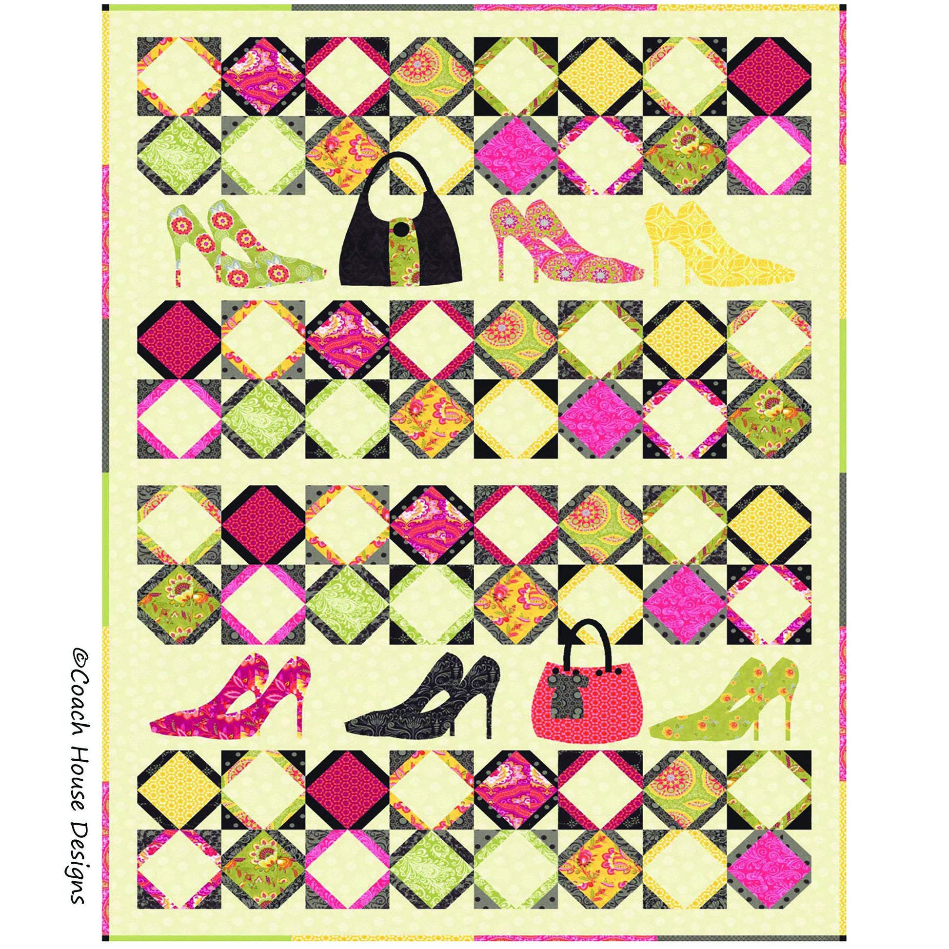 Do you love shoes and purses? This girly lap quilt (52" x 70") uses piecing and applique - featuring Little Black Dress 2 by Basic Grey and High Street by Lily Ashbury. It also uses Fat Quarters. Pink and green not your favorite colors? Not to worry!