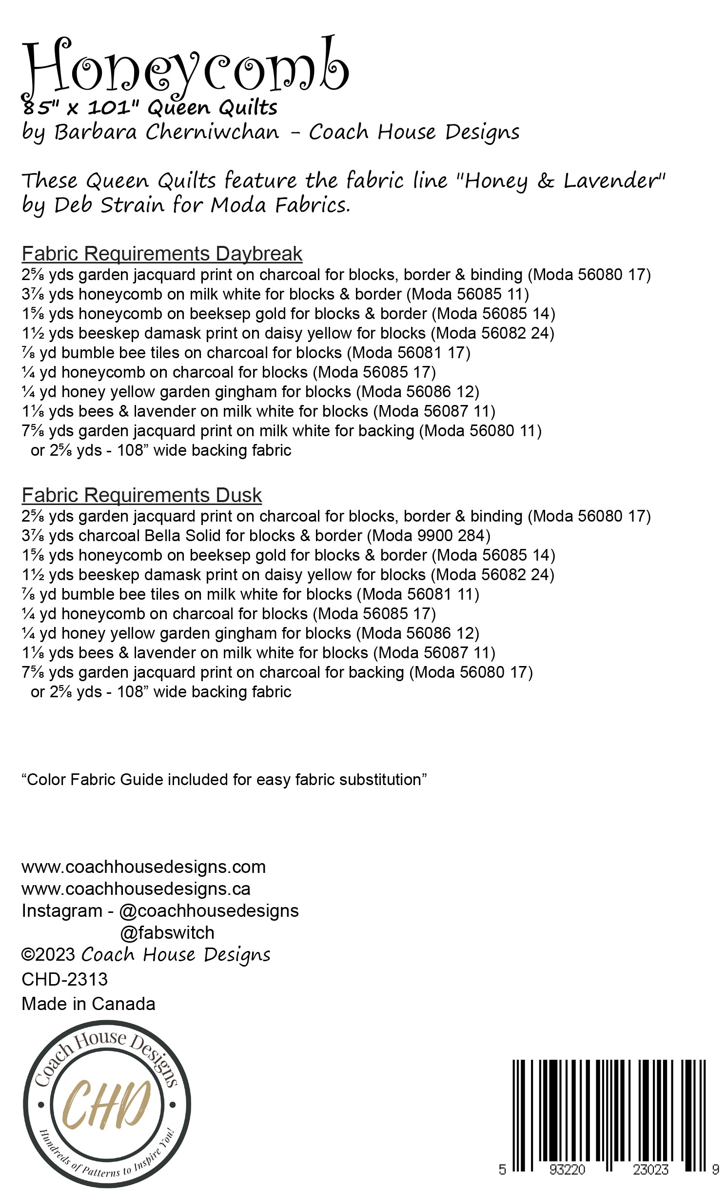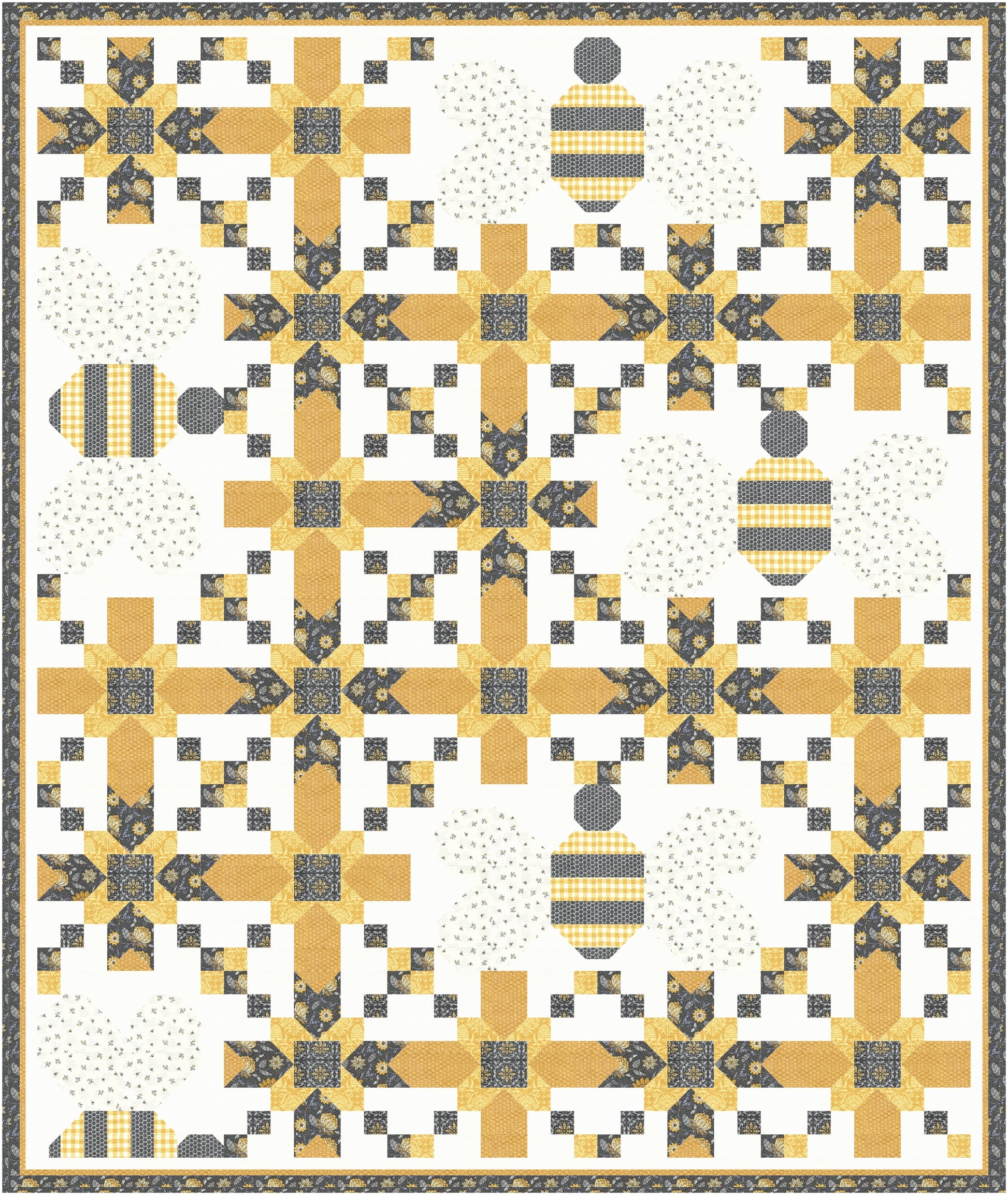 Whether it's on toast or in your favorite cup of tea, honey is good for the soul - and so is my new quilt pattern "Honeycomb". With adorable bees buzzing among the golden honeycomb, this quilt is sure to brighten up any room. This pattern uses Deb Strain's new fabric line "Honey & Lavender" for Moda Fabrics. The quilt finishes at 81" x 101" (Queen Quilt) and has instructions for both a light (Daybreak) and a Dark (Dusk) version. No Applique - all piecing!