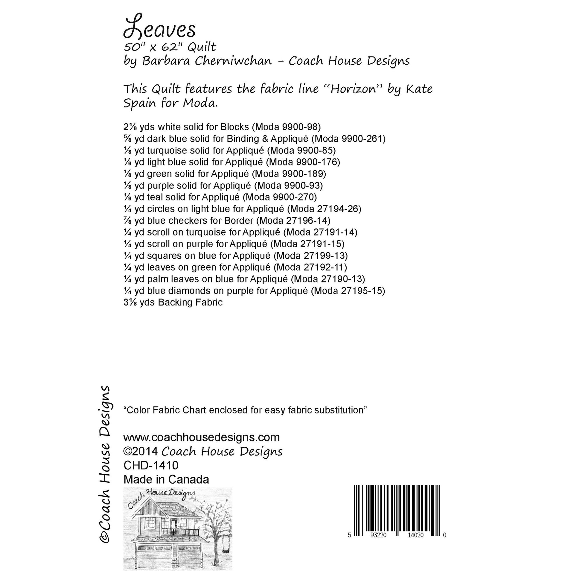 This 50" x 62" lap quilt pattern features Horizon by Kate Spain. The leaves are appliqued on squares which are then sewn together which makes the placement and appliqueing of the leaves easier.  Shown in beautiful blues and greens, this spring/summer quilt could easily become a fall quilt with a change of colors.