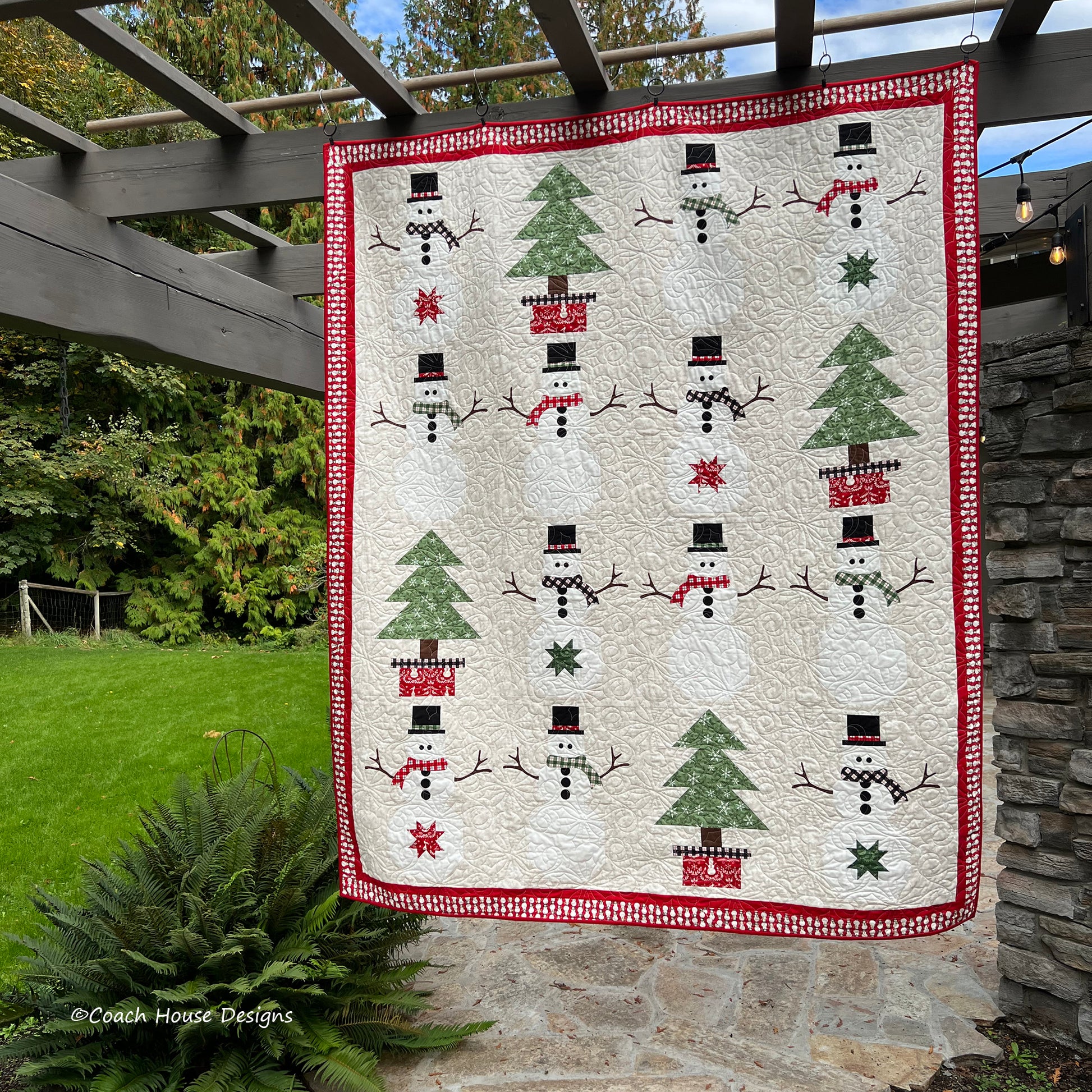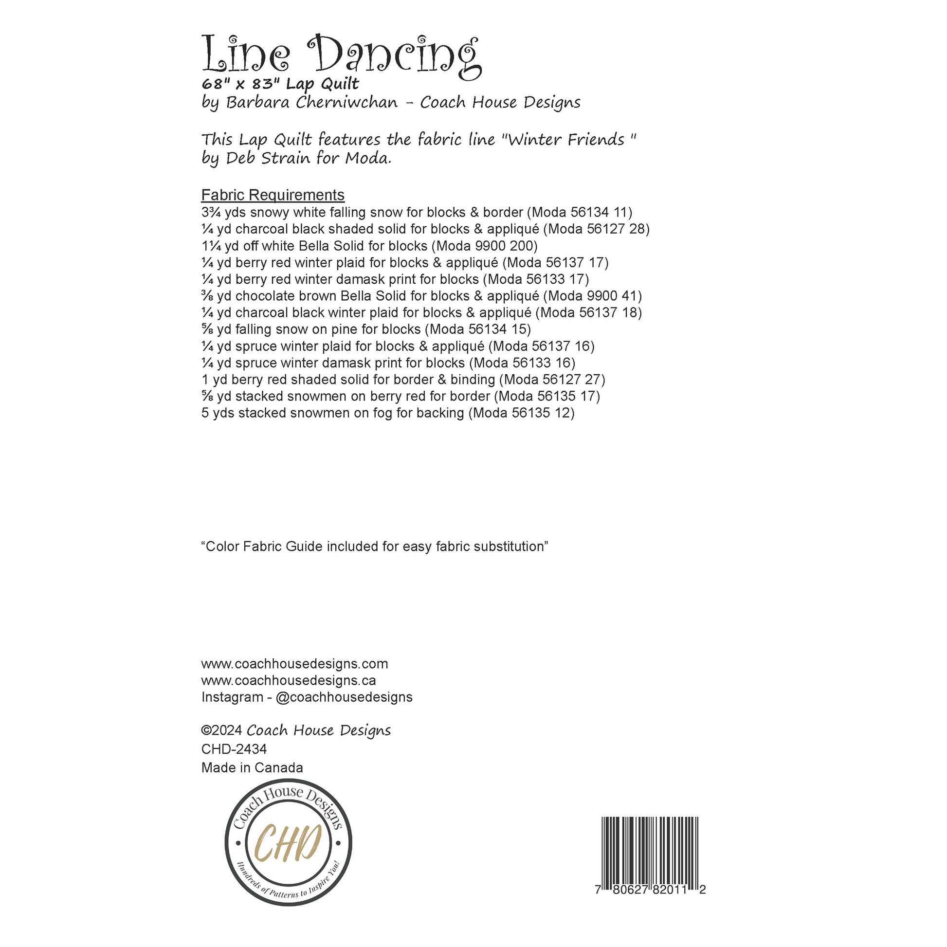 There is nothing frosty about this snowmen quilt....but there is something adorable about it! My latest pattern "Line Dancing" is inspired by the beautiful artwork in Deb Strain's holiday collection "Winter Friends". Finishing at 68" x 63", the pattern features a tree block and a snowman block, which uses applique for the details in the block.