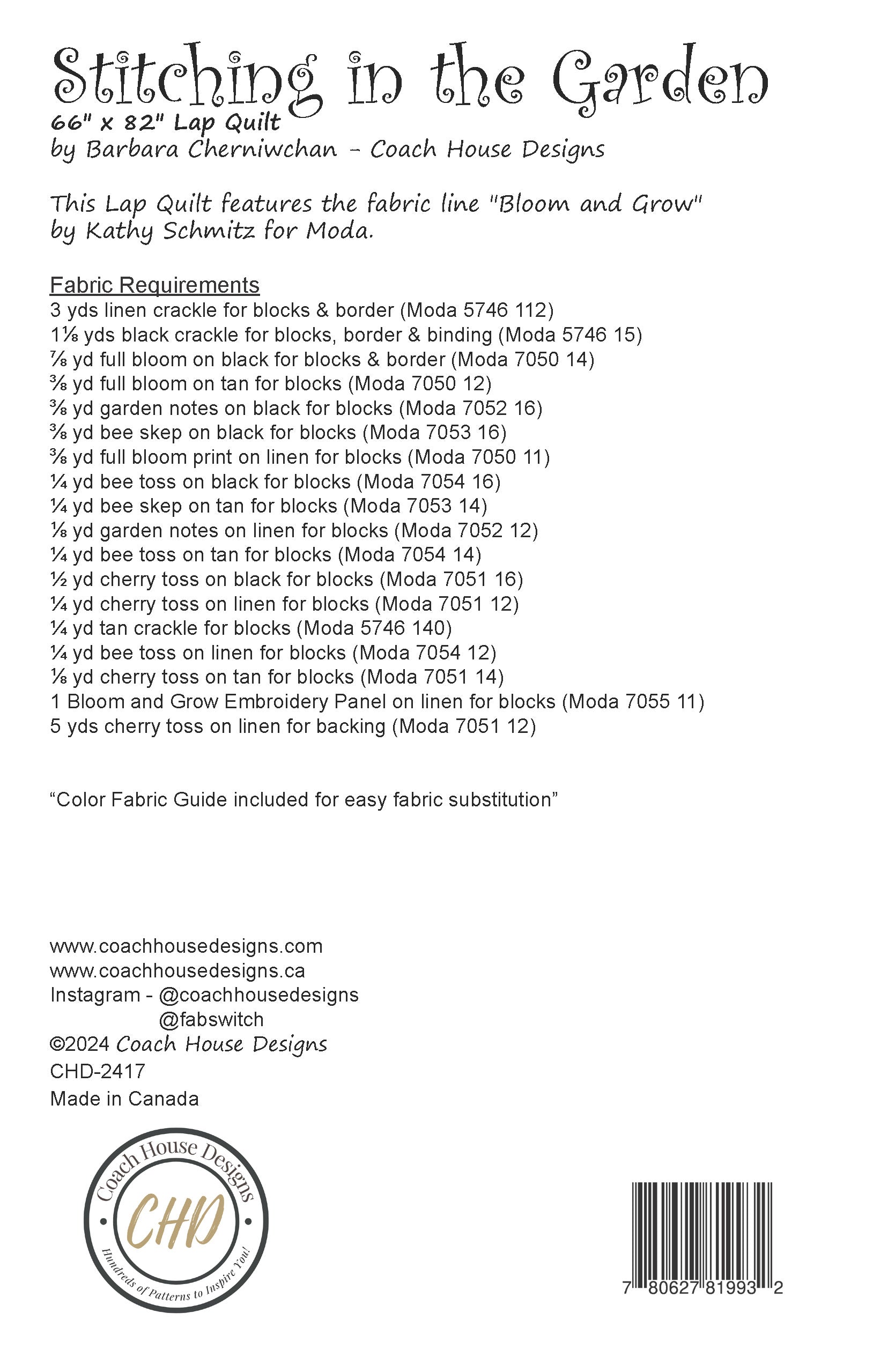 My Stitching in the Garden lap quilt pattern measures 66" x 82" and features the stitchery panel from Kathy Schmitz's newest fabric line "Bloom and Grow". The images are printed on the fabric and you can leave them as is or embellish them with embroidery. The stitchery blocks are framed in star, owl and milk can blocks which are surrounded by bees and butterflies. This is a perfect project for the winter months so make sure you put it on your Christmas list!