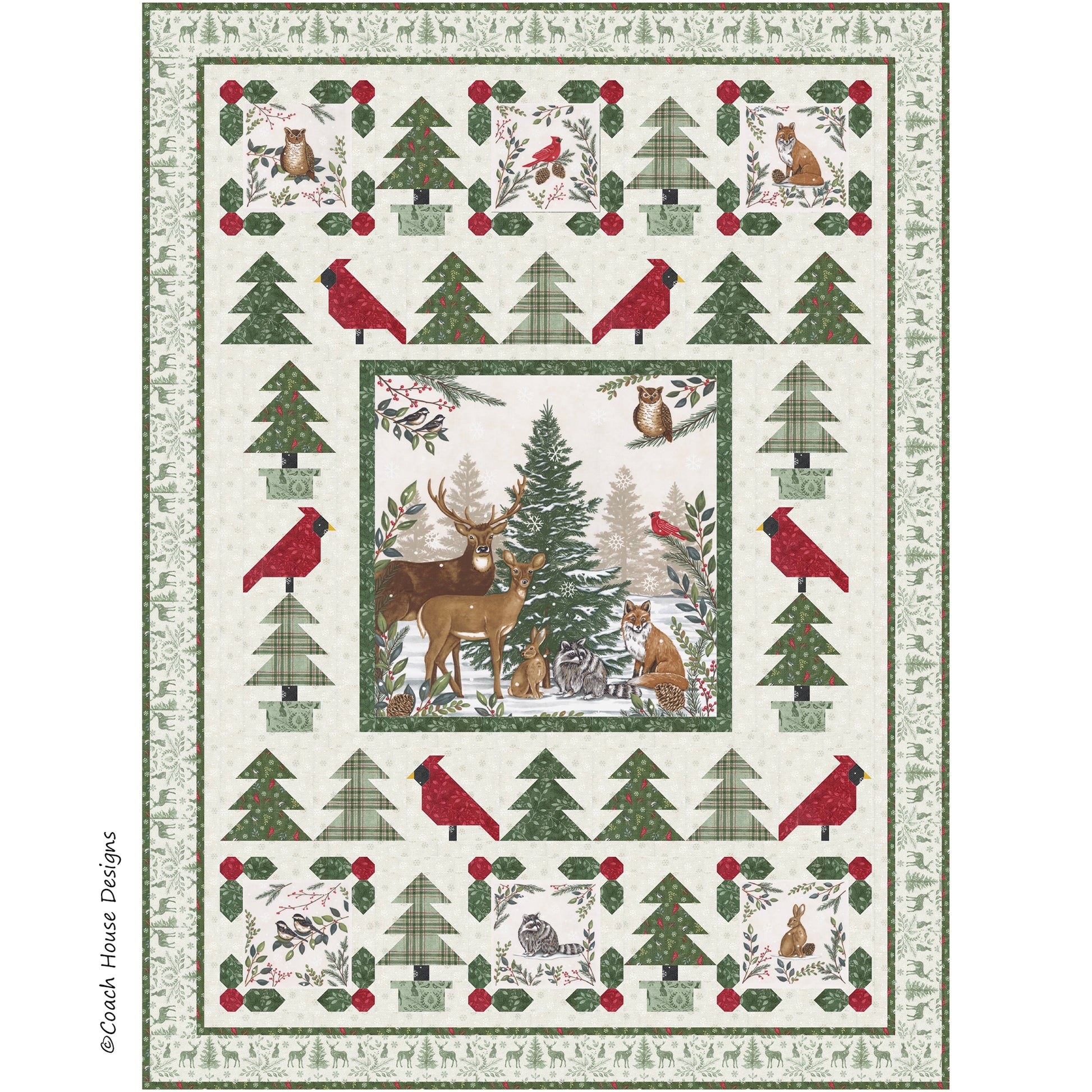 Finishing at 51" x 69", this lap quilt is all piecing and no applique. It uses the panel from the fabric line "Woodland Winter" by Deb Strain for Moda.