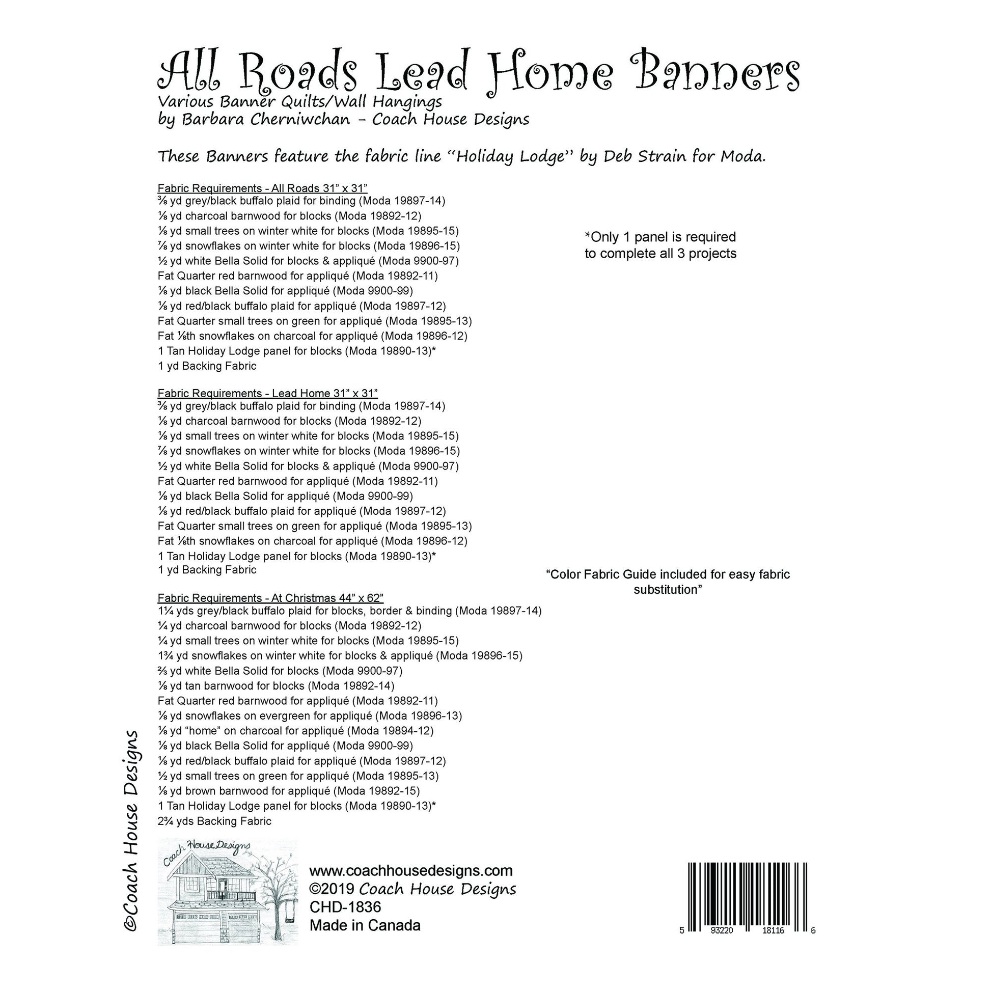This 3 project (2 - 31" square, 1 - 44" x 62") wall quilt pattern features Deb Strain’s Holiday Lodge fabric line for Moda and uses the Holiday Lodge panel. Pattern and fabric were released May 2019.