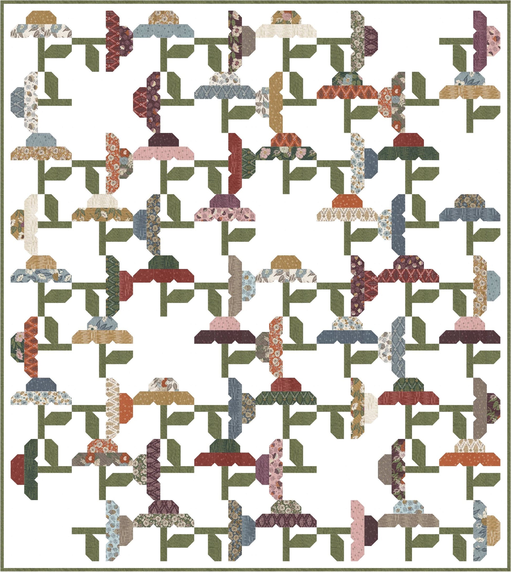 A field of flowers can look so different in the brightness of day or the darkness of night. This pattern uses a " Slow Stroll" layer cake by Fancy That Design House for Moda to build a meadow of coneflowers. The flowers are set in either a white or black background because I couldn't decide which one I liked better. The quilts measure 74" x 83". The pattern is available now and the fabric will be in stores in May 2022.