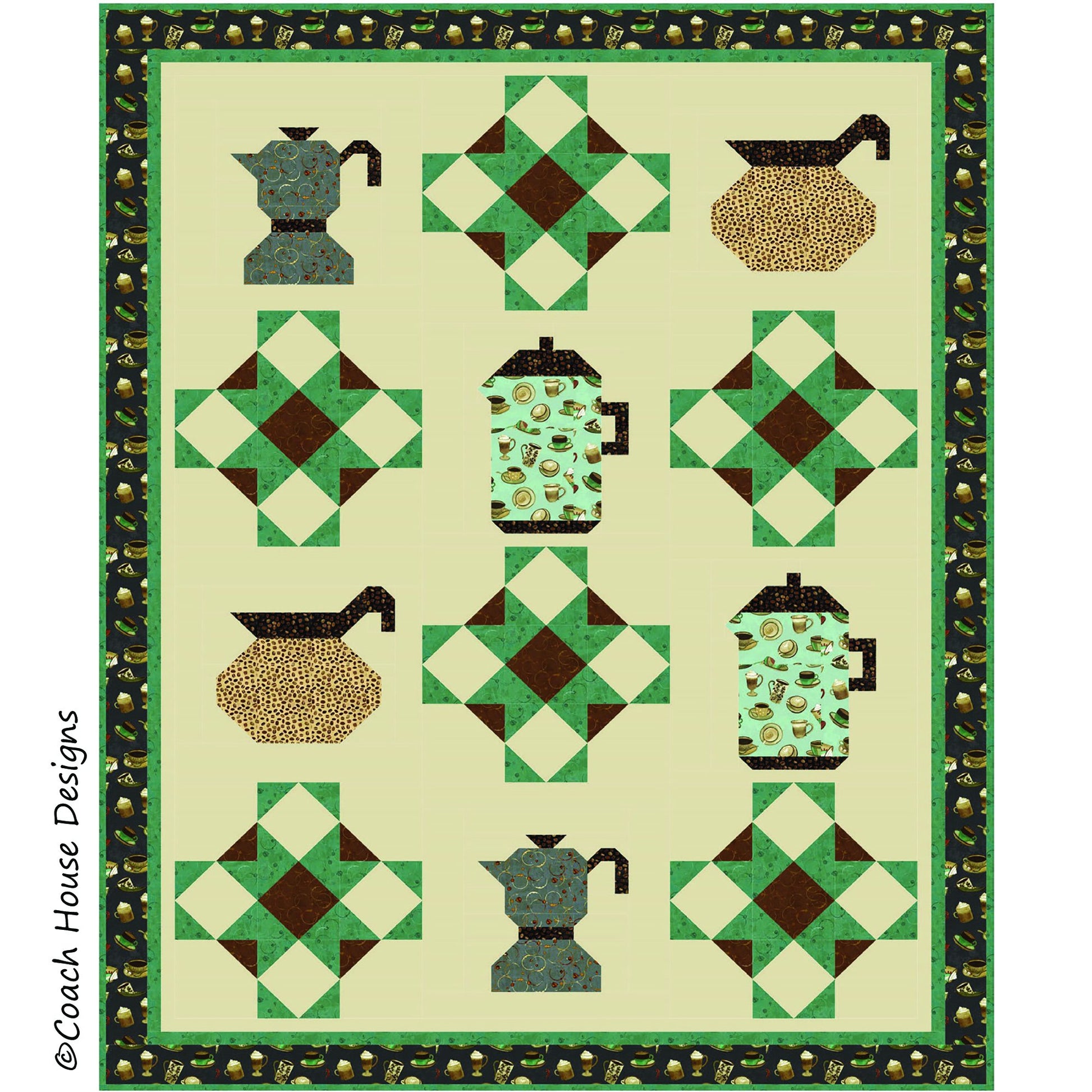 This 64" x 82" lap quilt pattern features Sue Zipkin’s Coffee Shop fabric line for Clothworks. The fabric and pattern were released in October 2019.