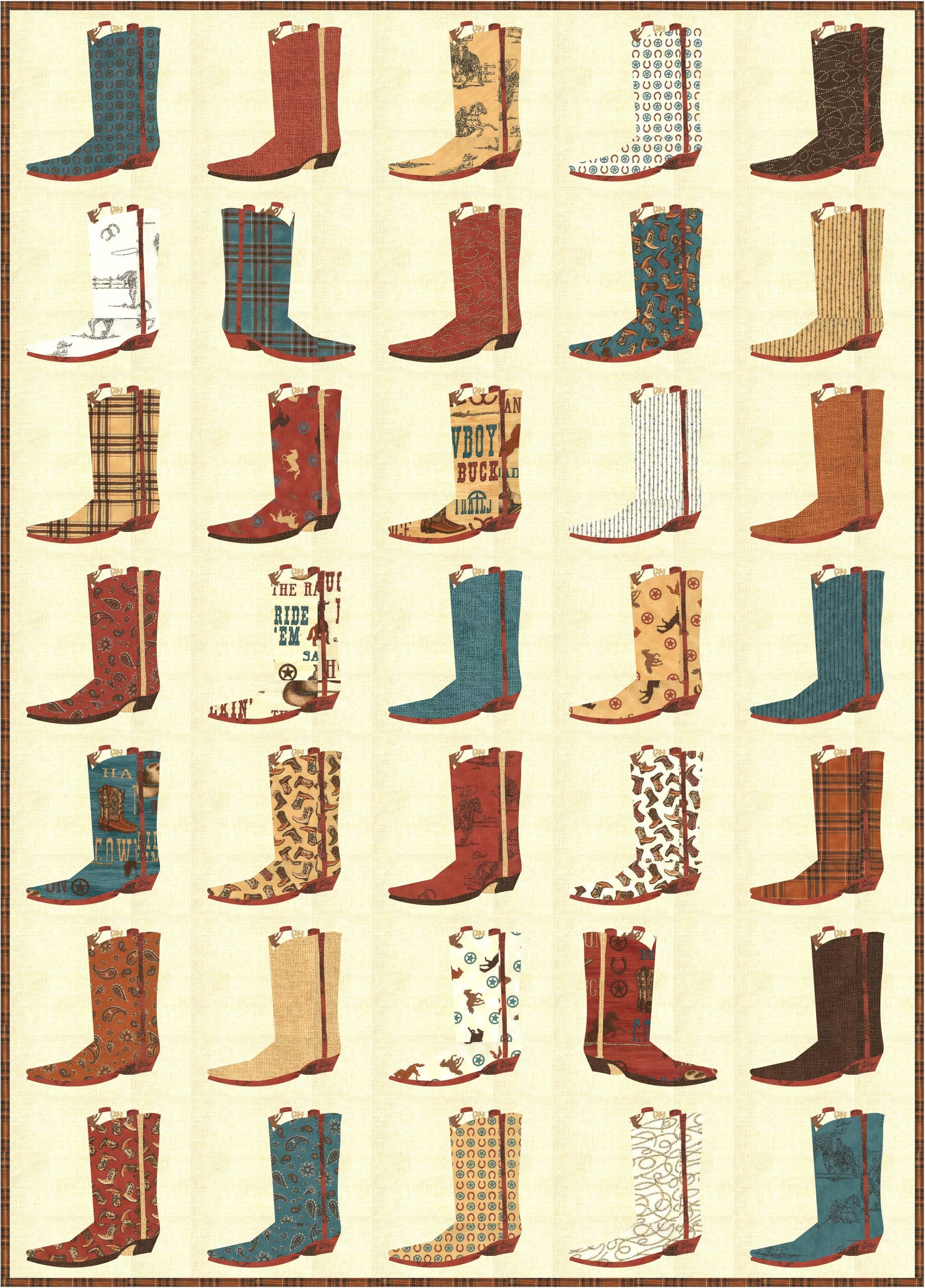 If you love cowboy boots, this pattern is for you.  35 different cowboy boots on this 50" x 70" lap quilt which uses the Home on the Range Layer Cake by Deb Strain.  Yeehaw! Fabric in stores in April 2021.