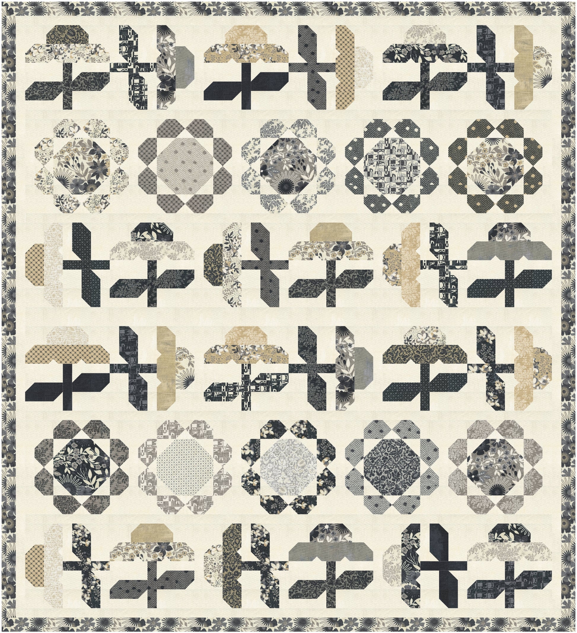 Rows of Daisies and Cornflowers. This 60" x 66" lap quilt features two floral blocks and uses a Layer Cake (42 - 10" squares). Pattern features Date Night by Basic Grey but could be used with any Layer Cake.
