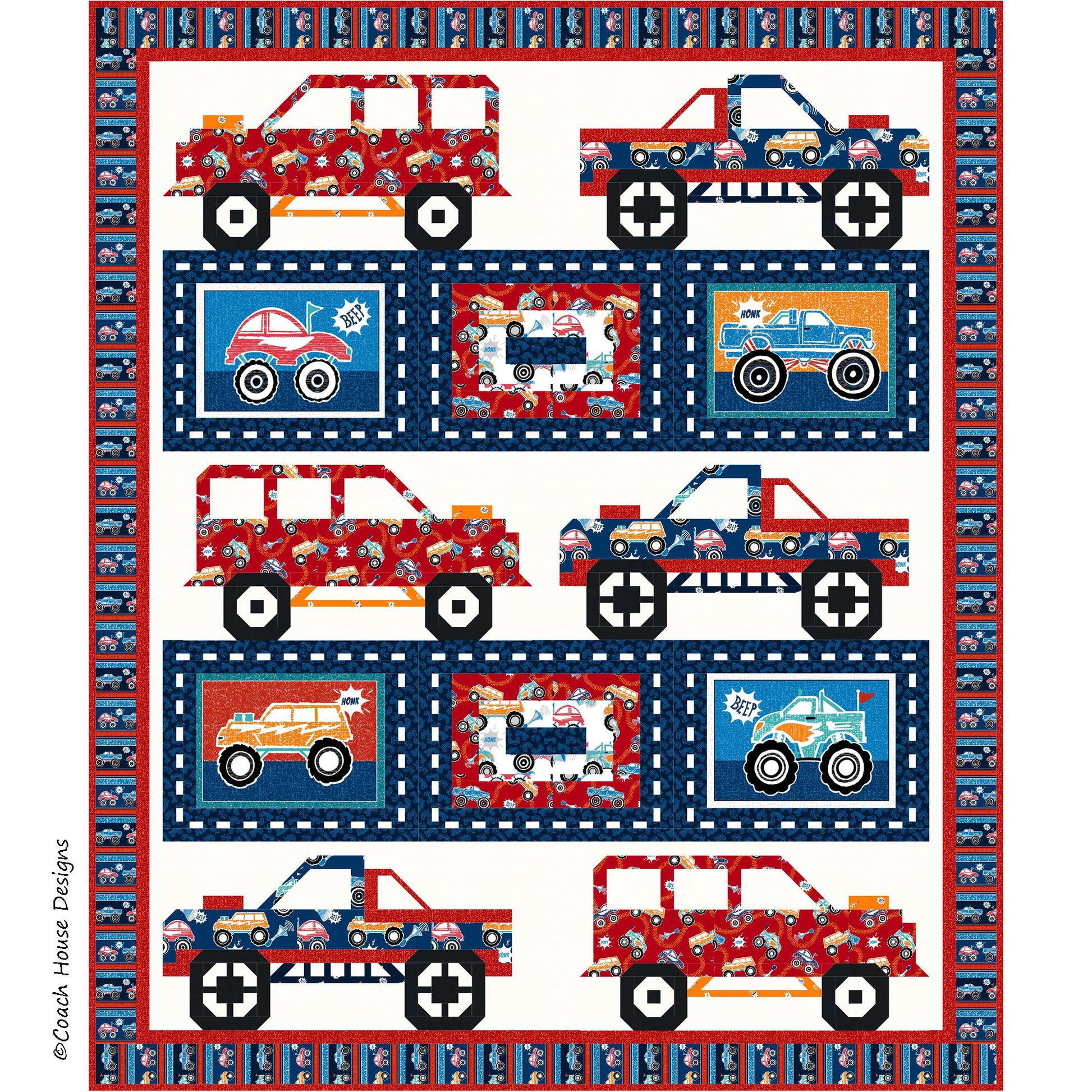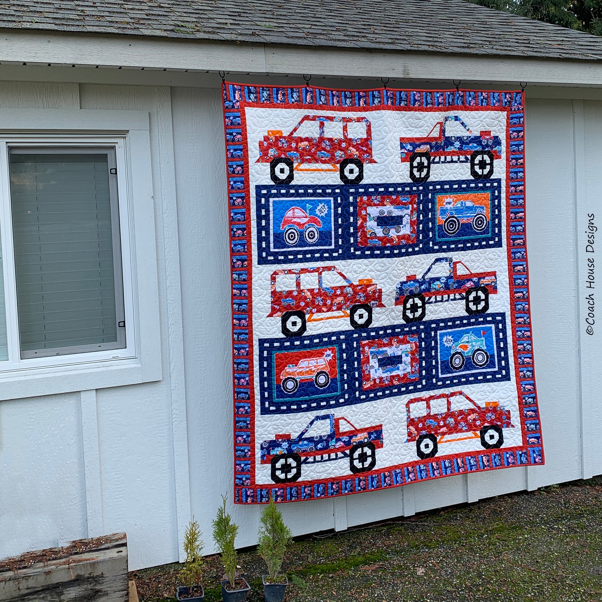 This 67" x 80" Lap quilt featuring the fabric line "Monster Trucks" by Michael Miller Fabrics is perfect for the Monster Truck fan in your house. It uses the Monster Truck panel and all the other Monster Trucks are pieced (and fun to make!)