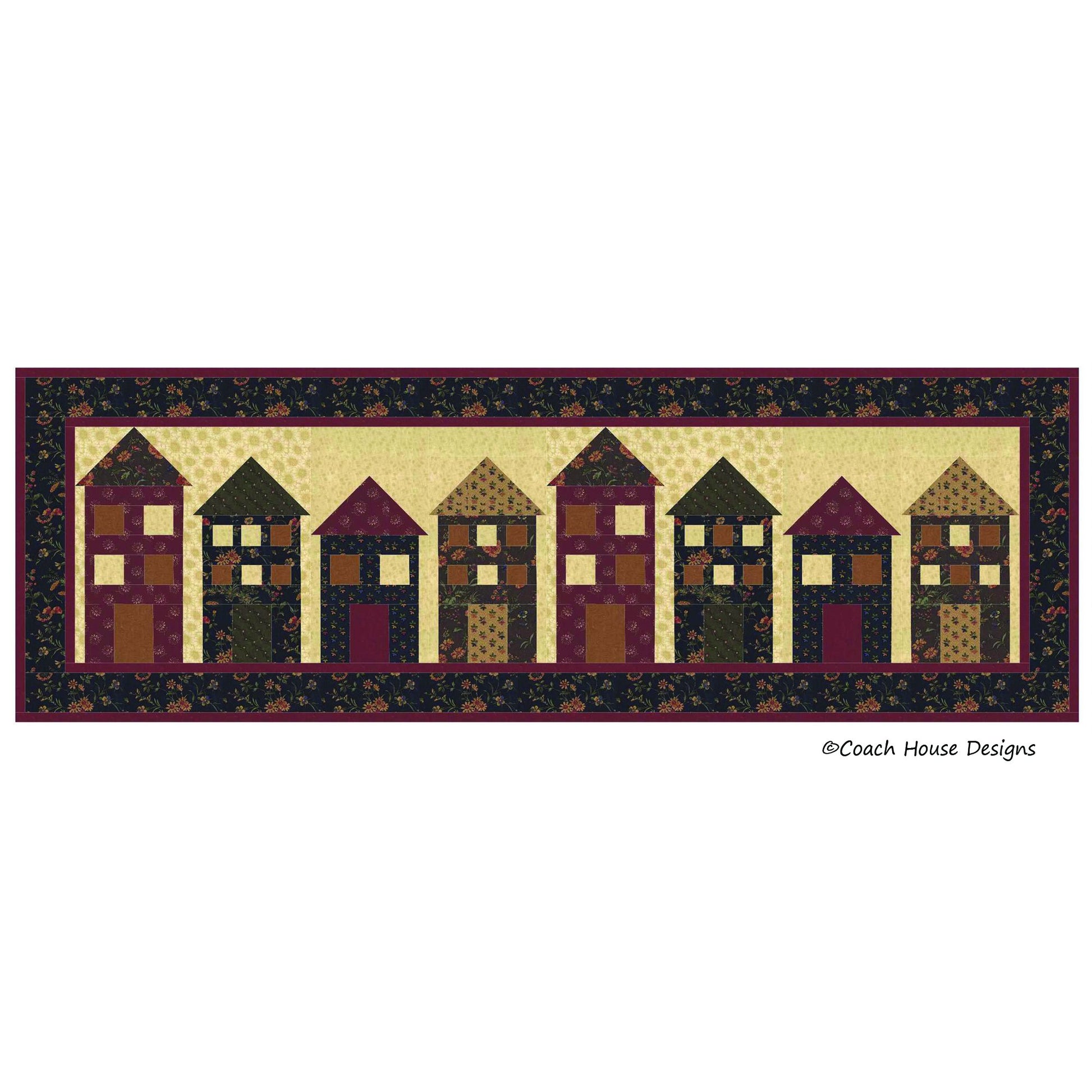This house row table runner measures 53" x 17" and is shown in "Sunflower Song" by Kansas Troubles. It would look cute in any fabric!