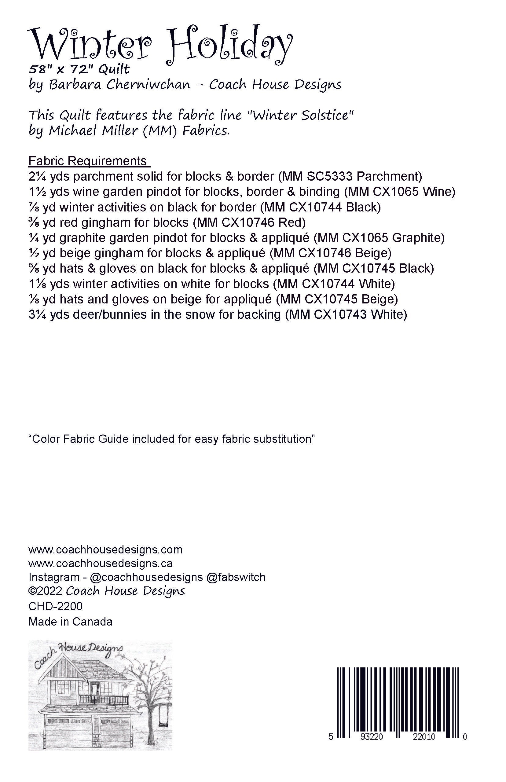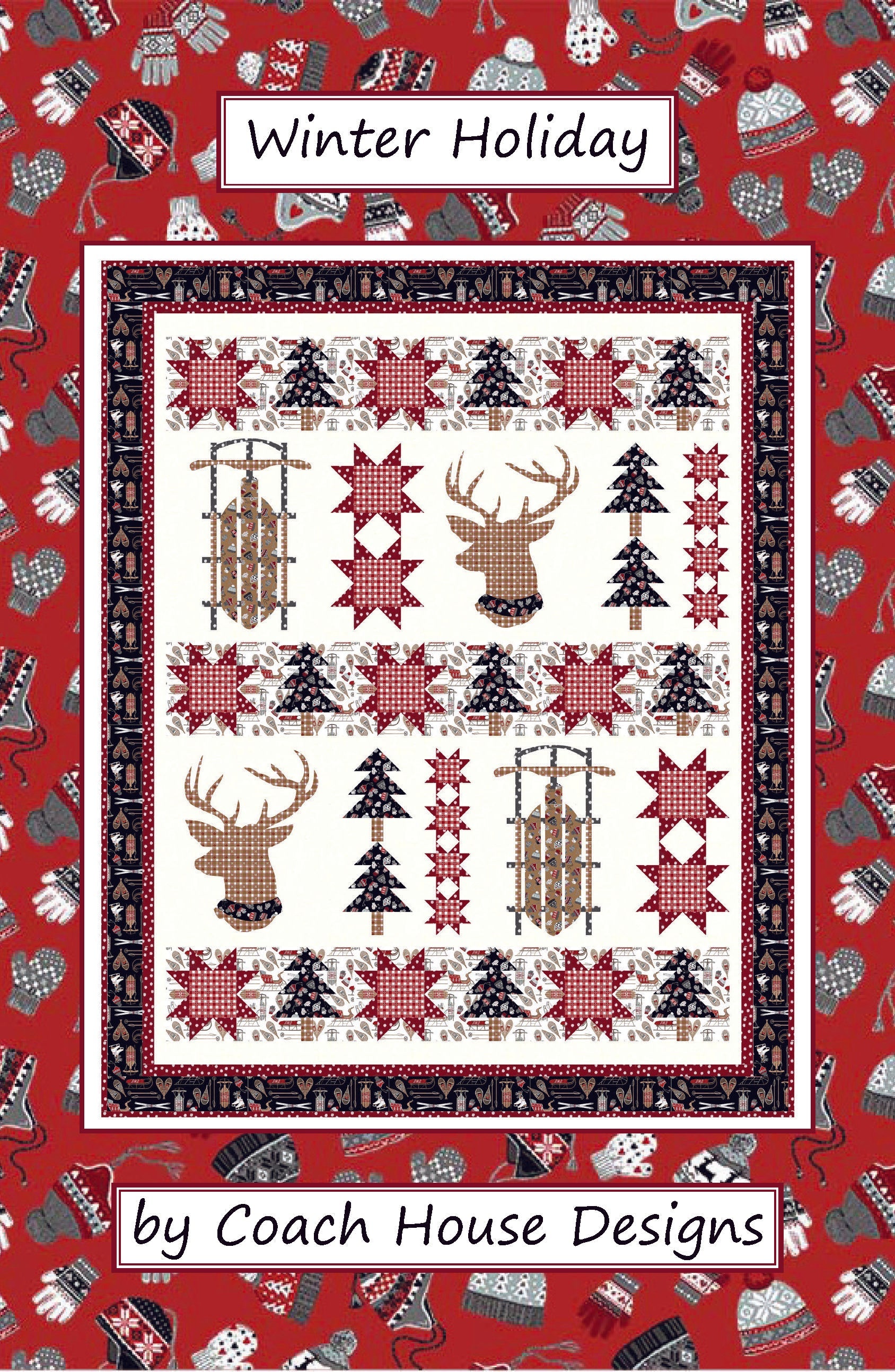 Winter Holiday is a 58" x 72" lap quilt featuring the fabric line "Winter Solstice" by Michael Miller Fabrics. The detailed artwork on this fabric is amazing! If you are a fan of winter outdoor fun or are looking for a quilt that says winter and not Christmas, this is a great choice. The piecing is simple with enough applique to make it special.