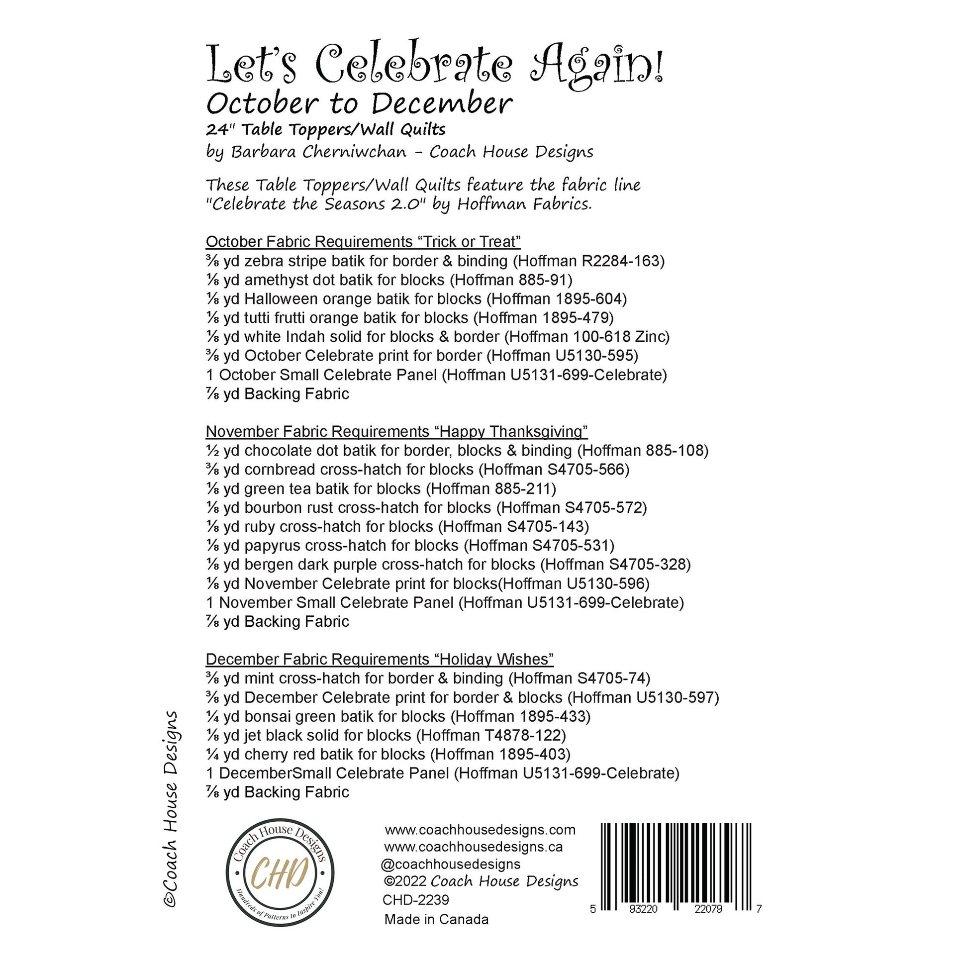 This pattern includes instructions to make 3 - 24" table/wall quilts to celebrate October - Trick or Treat, November - Happy Thanksgiving and December - Holiday Wishes. Fun monthly projects to help celebrate special occasions! Features Celebrate 2.0 by Hoffman Fabrics. Fabric available January 2023, patterns available now.