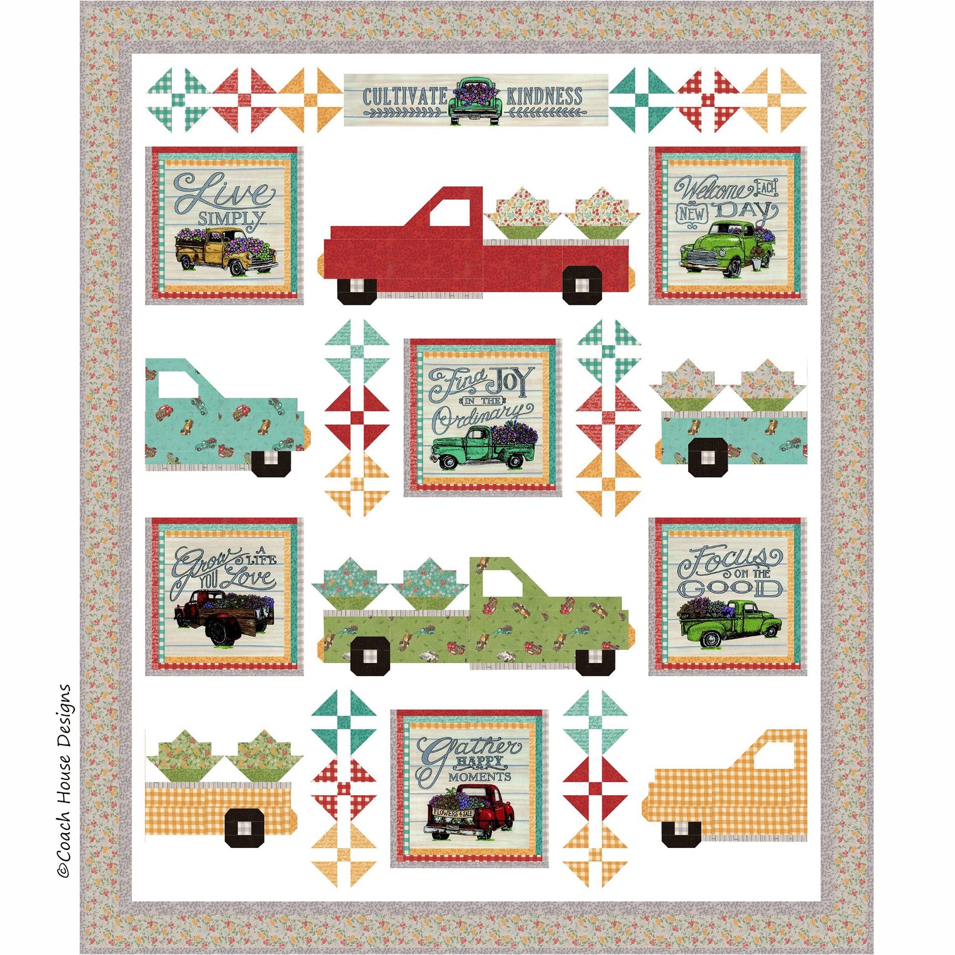 This 59" x 71" bright summer quilt features a panel from Deb Strain’s Cultivate Kindness fabric line which was released in March 2020.  If you are looking to substitute the panel blocks, you will need 9 1/2" squares.