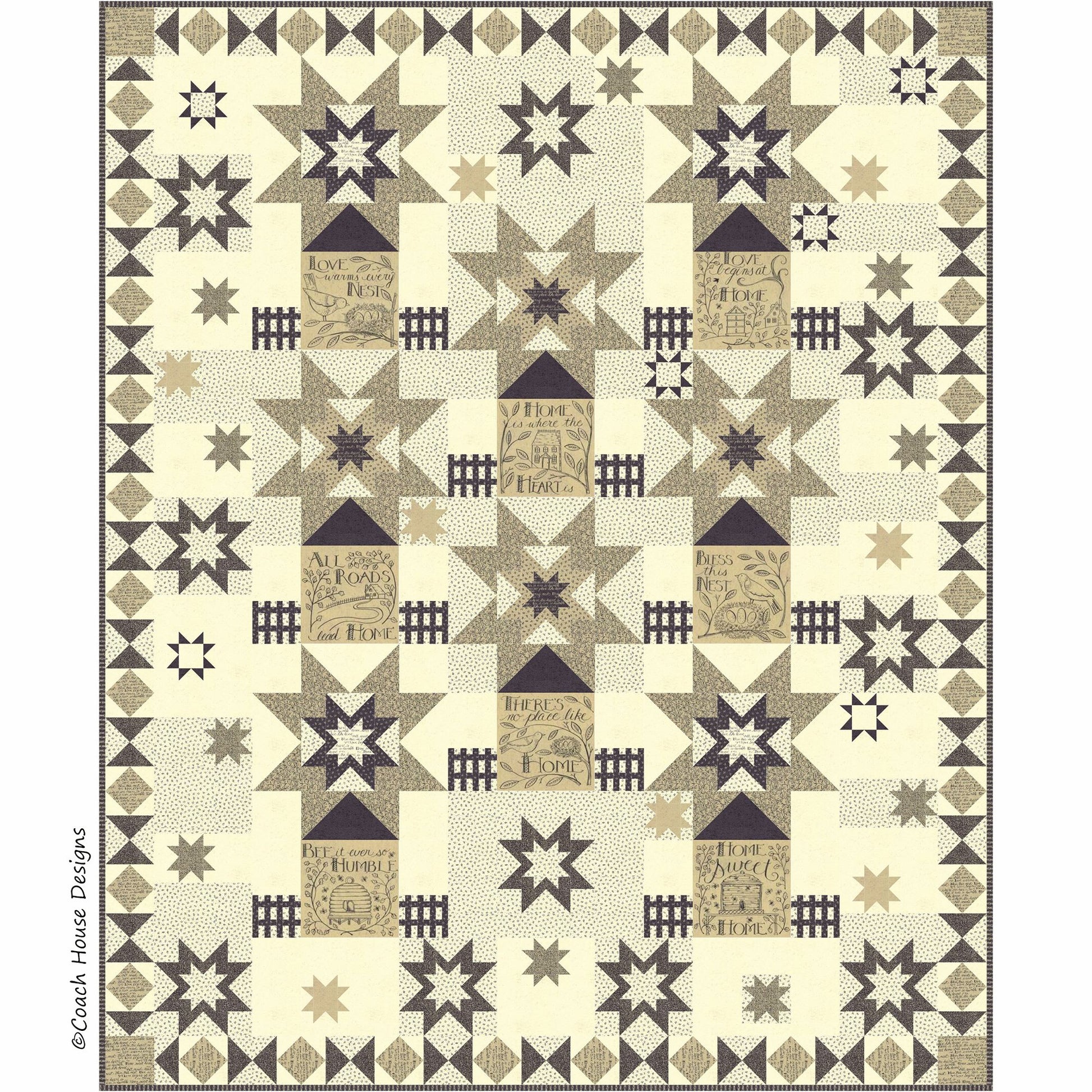 This twin quilt pattern (72" x 88") features Kathy Schmitz’s Home fabric line for Moda and uses the Home panel.