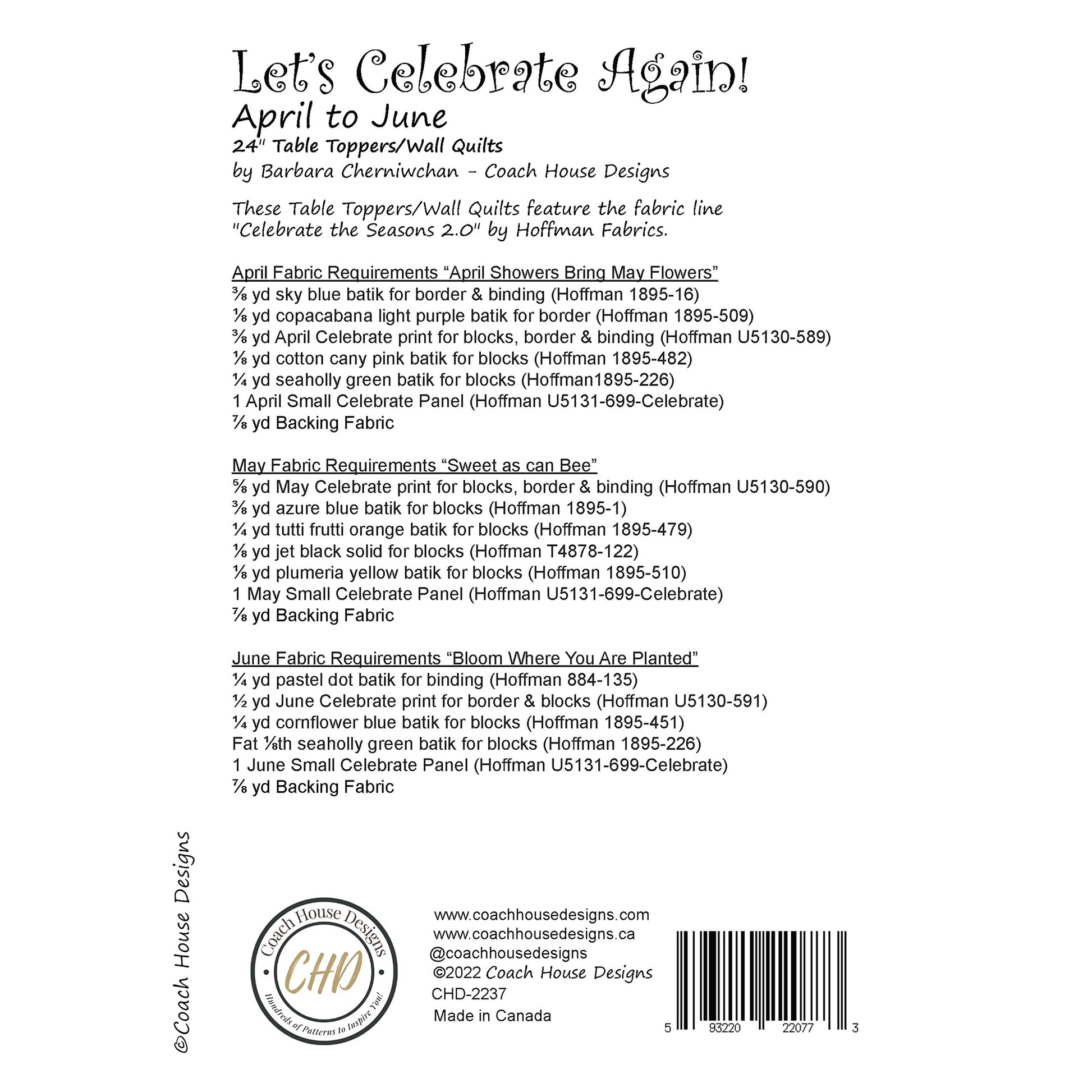 This pattern includes instructions to make 3 - 24" table/wall quilts to celebrate April - April Showers Bring May Flowers, May - Sweet as Can Bee and June - Bloom Where You Are Planted. Fun monthly projects to help celebrate special occasions! Features Celebrate 2.0 by Hoffman Fabrics. Fabric available January 2023, patterns available now.