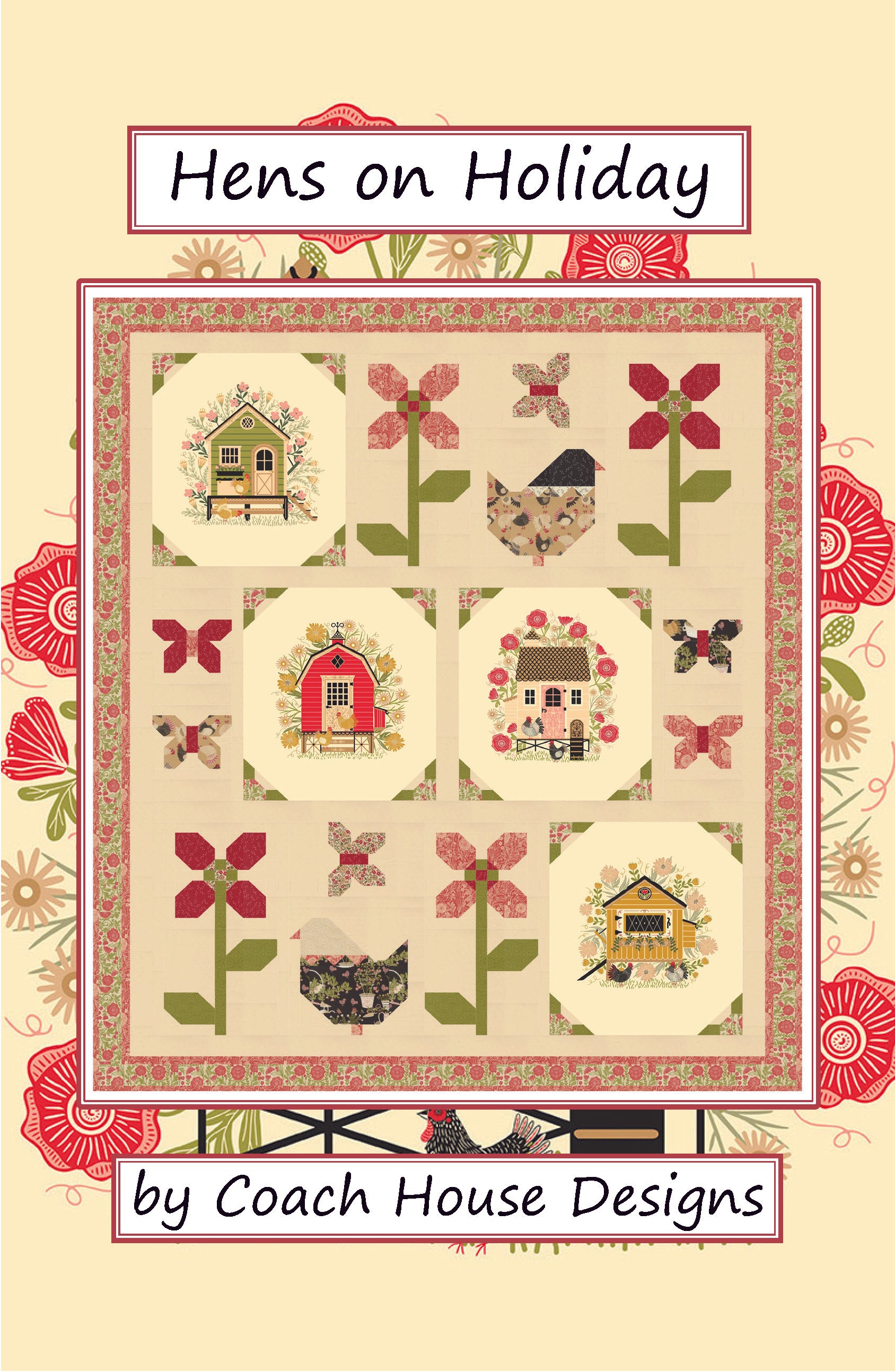 Hens on Holiday Quilt Pattern by Coach House Designs is a celebration of cheerful chickens, fresh flowers, and fluttering butterflies—all dressed up for a seasonal getaway!