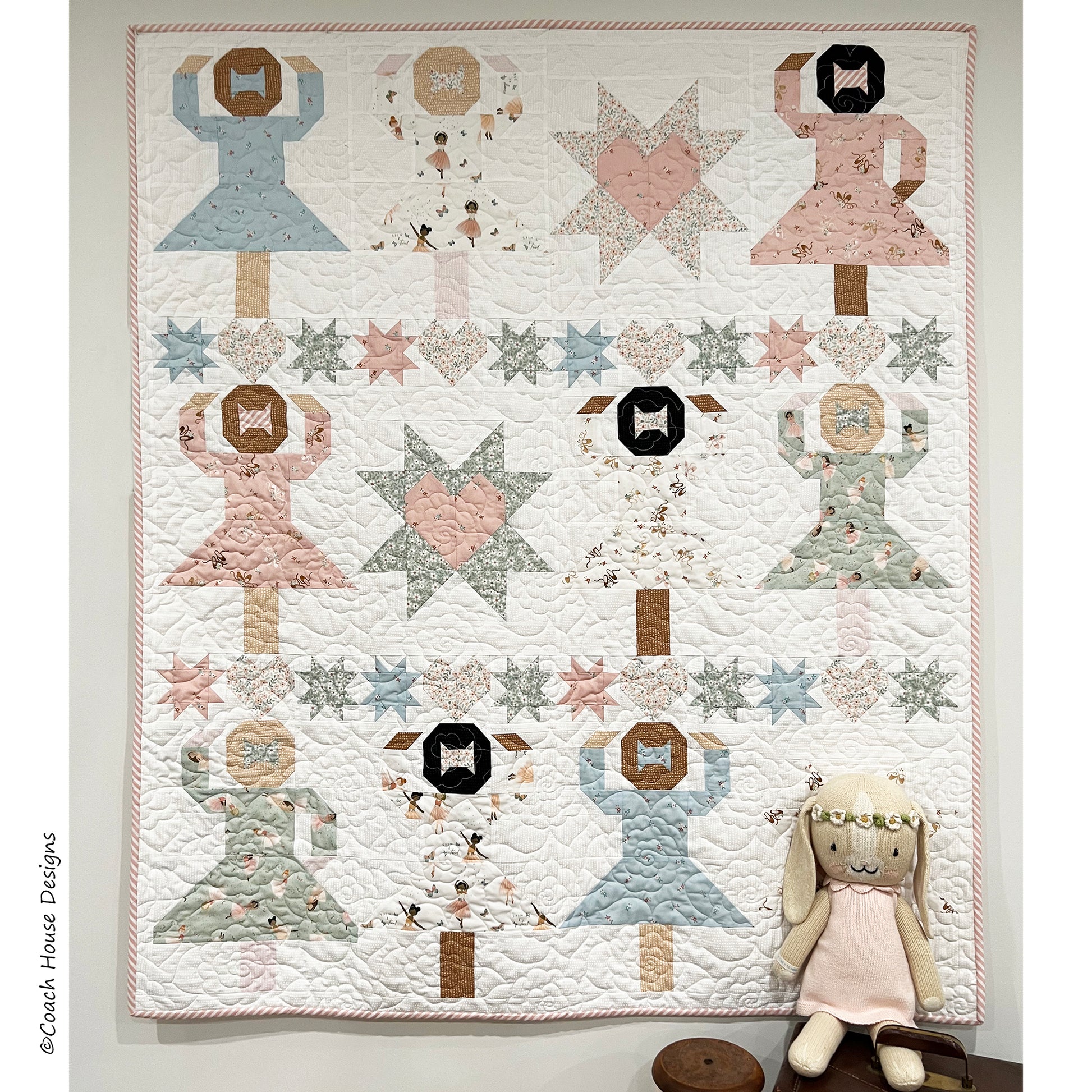 Do you have a special little one who loves to spin and twirl? Celebrate the "twinkle toes" in your life with our "Ballerinas" quilt pattern. Finishing at 50" x 58", this whimsical and charming quilt is perfect for children who dream of leaping, twirling, and pirouetting like graceful ballerinas. It features the fabric line "Return of the Jete" by Dear Stella Fabrics and would make for the most adorable keepsake.