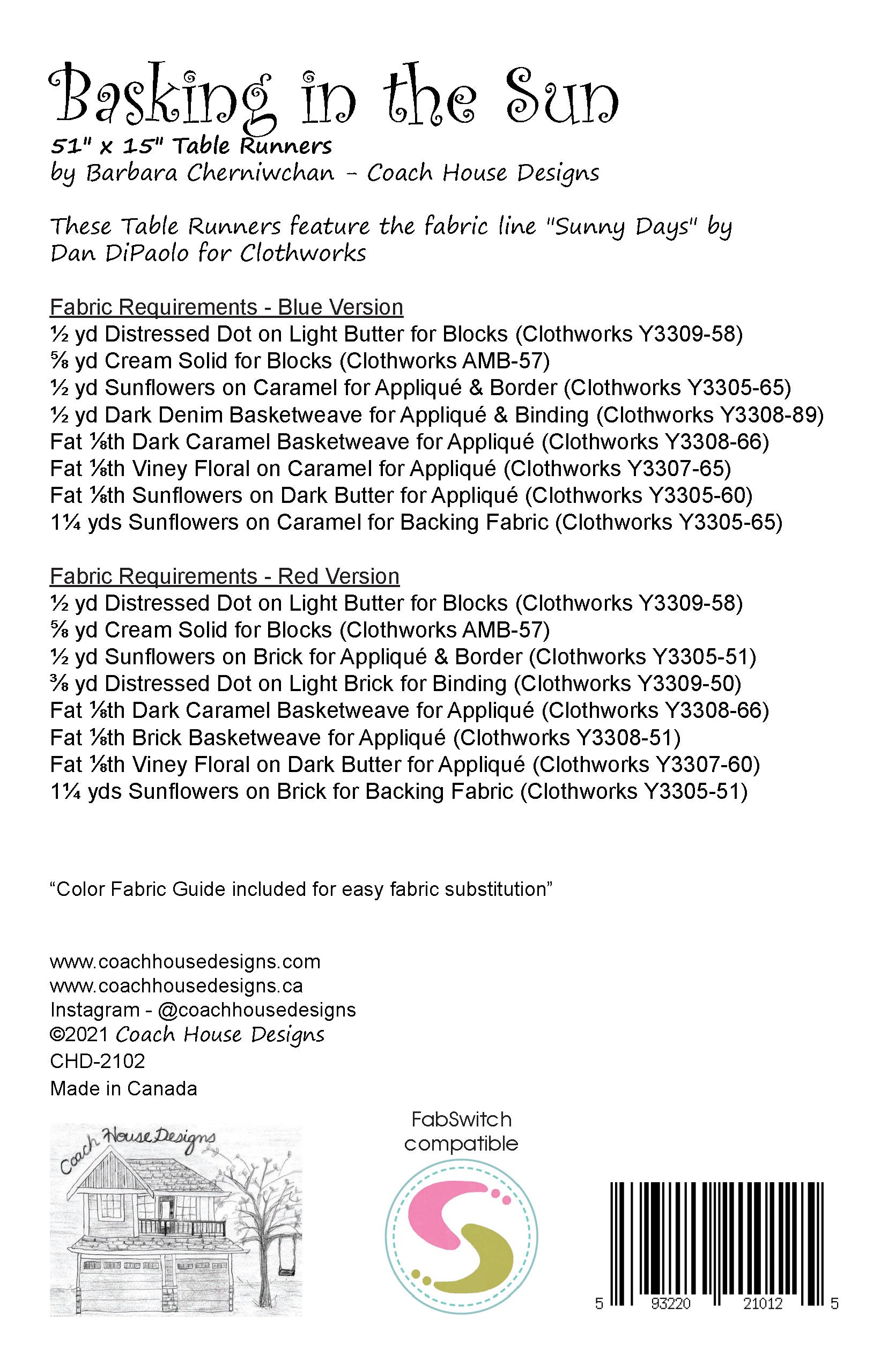 This 15" x 51" folksy Table Runner features Dan DiPaolo's fabric line "Sunny Days" for Clothworks. Pattern includes instructions to make the runner in two different colour ways - Red, and Blue.