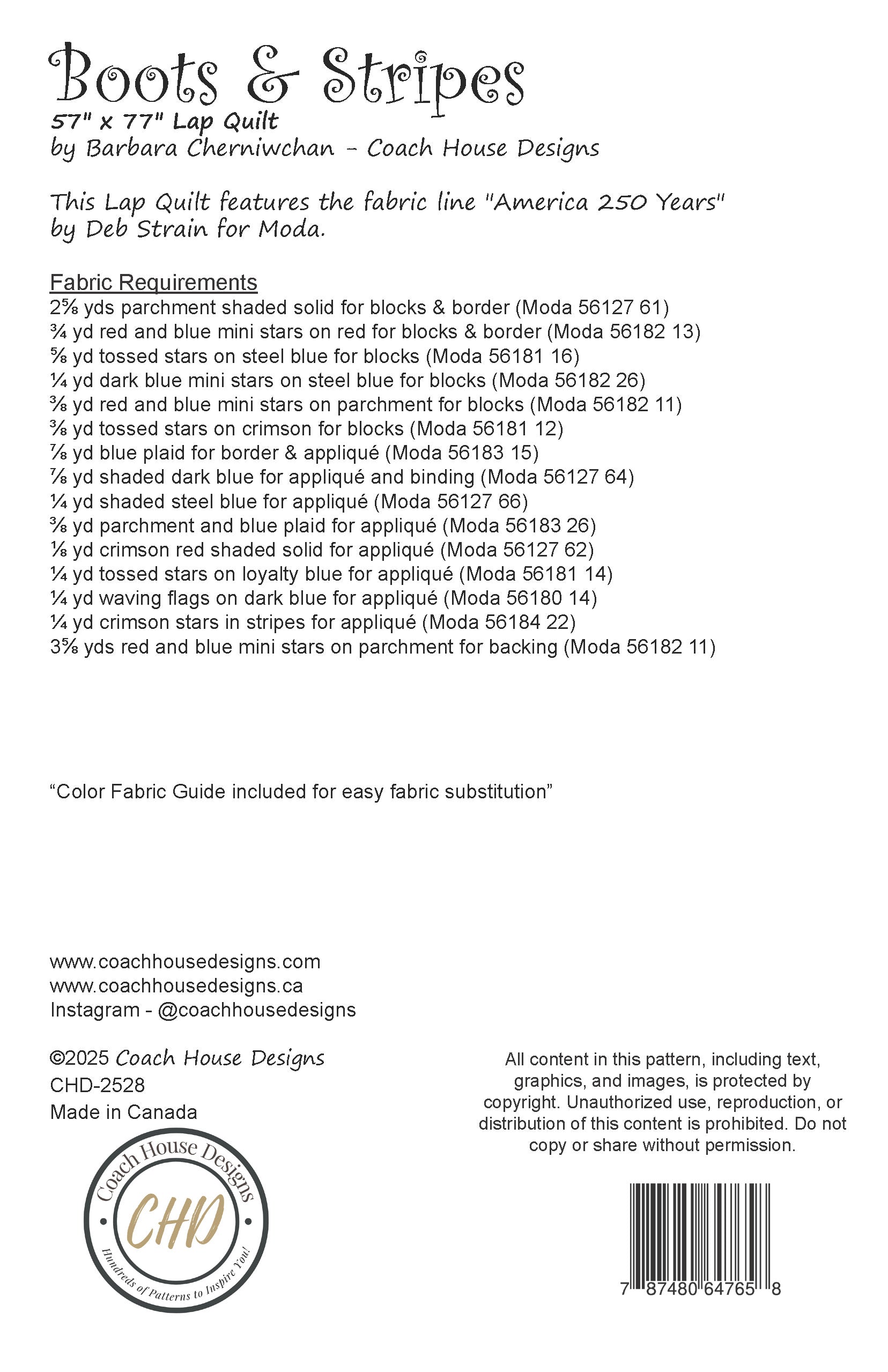 Saddle up for a star-spangled celebration with Boots & Stripes—a patriotic quilt pattern that blends classic Americana with a touch of Western charm. Finishing at 57" x 77", this lap-size beauty features appliqued cowboy boots, bold stripes, and scattered stars, all brought to life with Deb Strain’s newest America 250 Years fabric collection for Moda Fabrics.