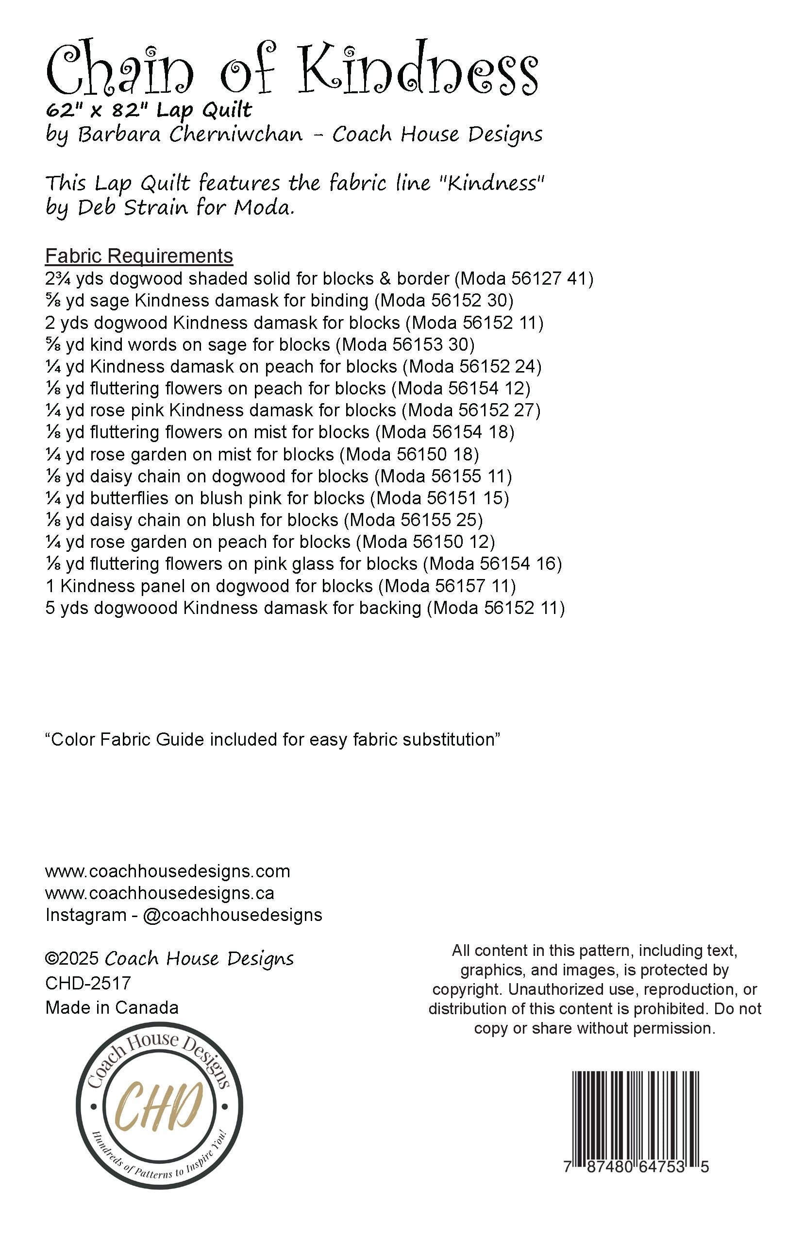 Flowing like a gentle chain of good deeds, the layout weaves together fabric panels and coordinating prints to create a visually striking, yet beginner-friendly design. Whether you're making it as a gift or to keep as a reminder of the kindness we all need more of, this quilt will bring beauty and meaning to any space.
