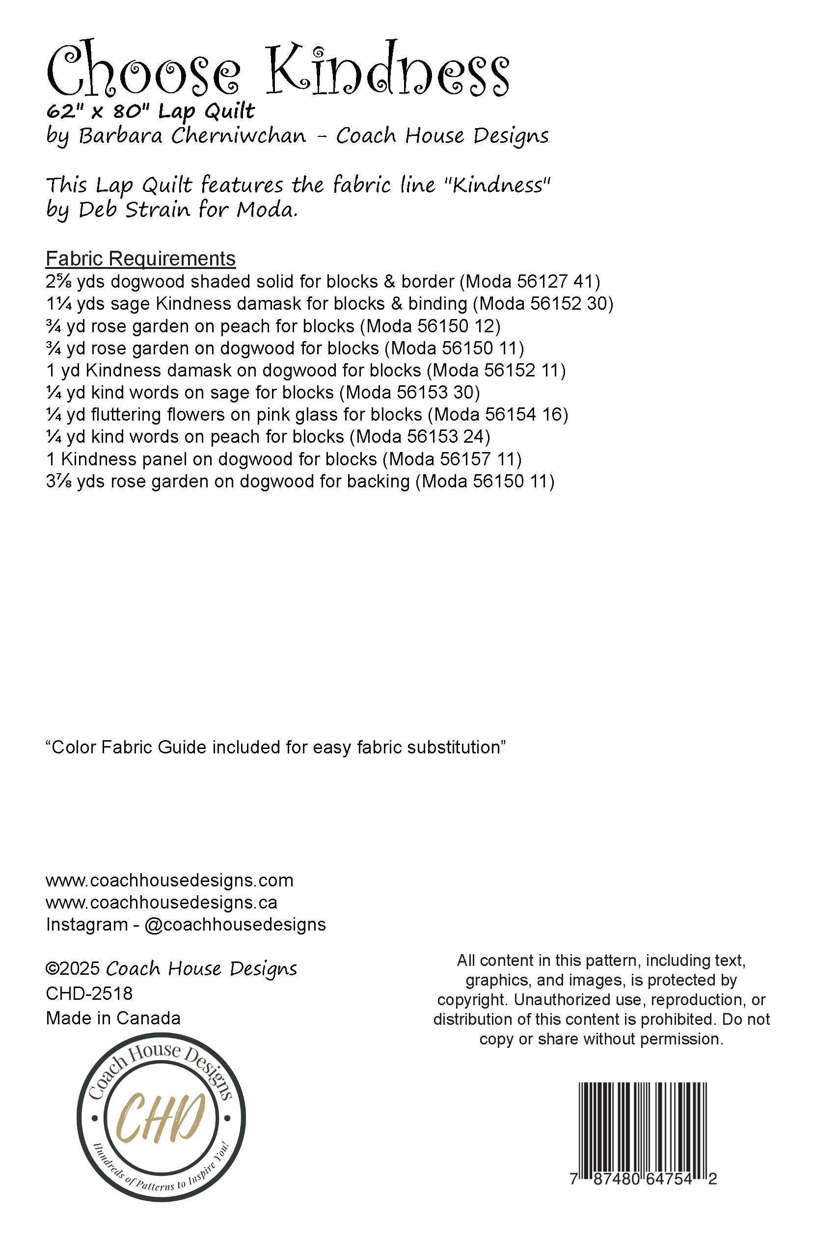Say hello to Choose Kindness—a cozy, heartwarming quilt pattern made to shine with the Kindness fabric collection by Deb Strain for Moda Fabrics. Measuring 62" x 80", this quilt brings together beautiful prints and meaningful panels to create something truly special. The quilt finishes at 62" x 80".