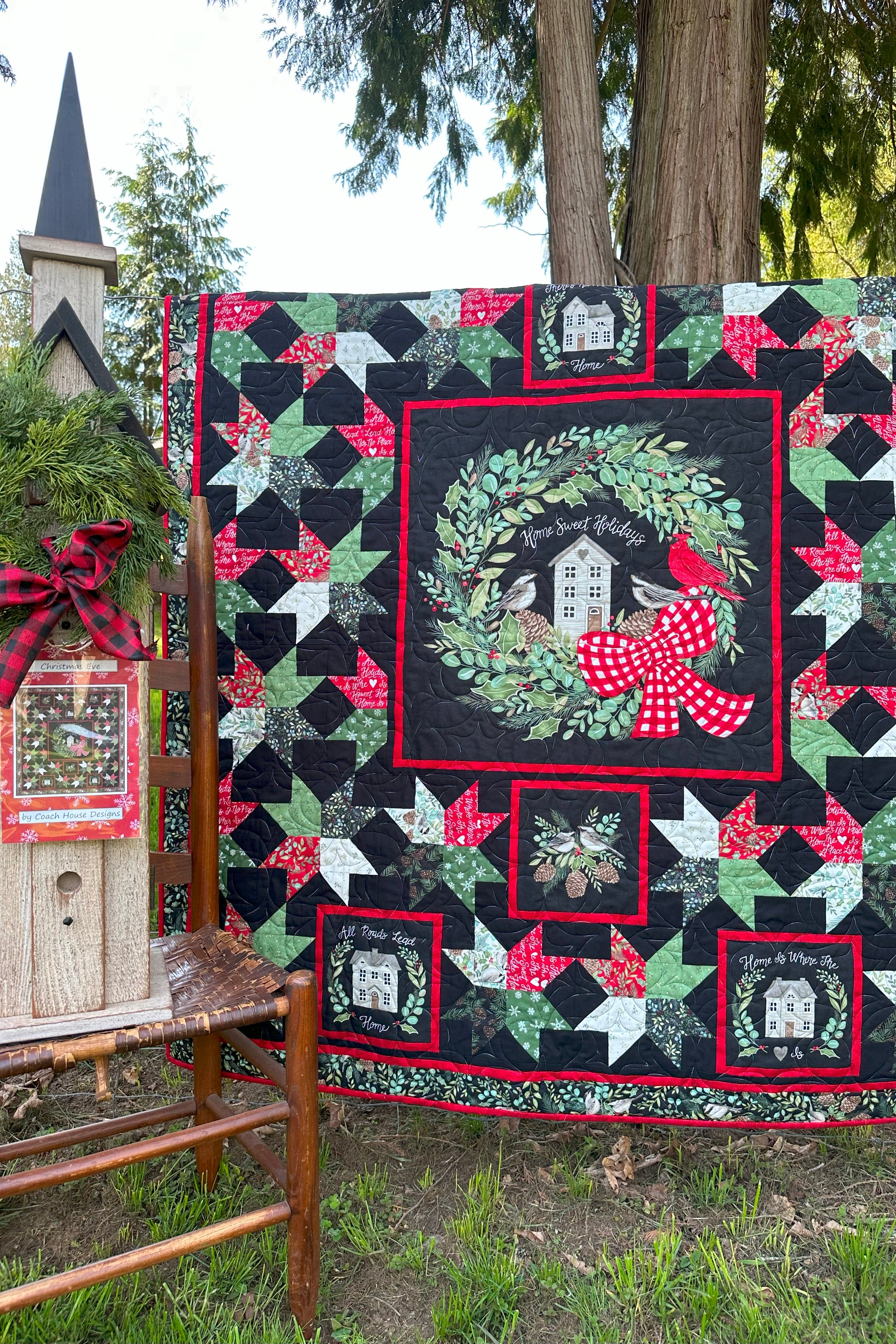This 54" x 62" lap quilt features Deb Strain's 2023 Christmas fabric line "Holidays at Home" for Moda Fabrics. The blocks from the charcoal panel are framed and surrounded by 4-fabric stars which makes Deb's artwork pop.