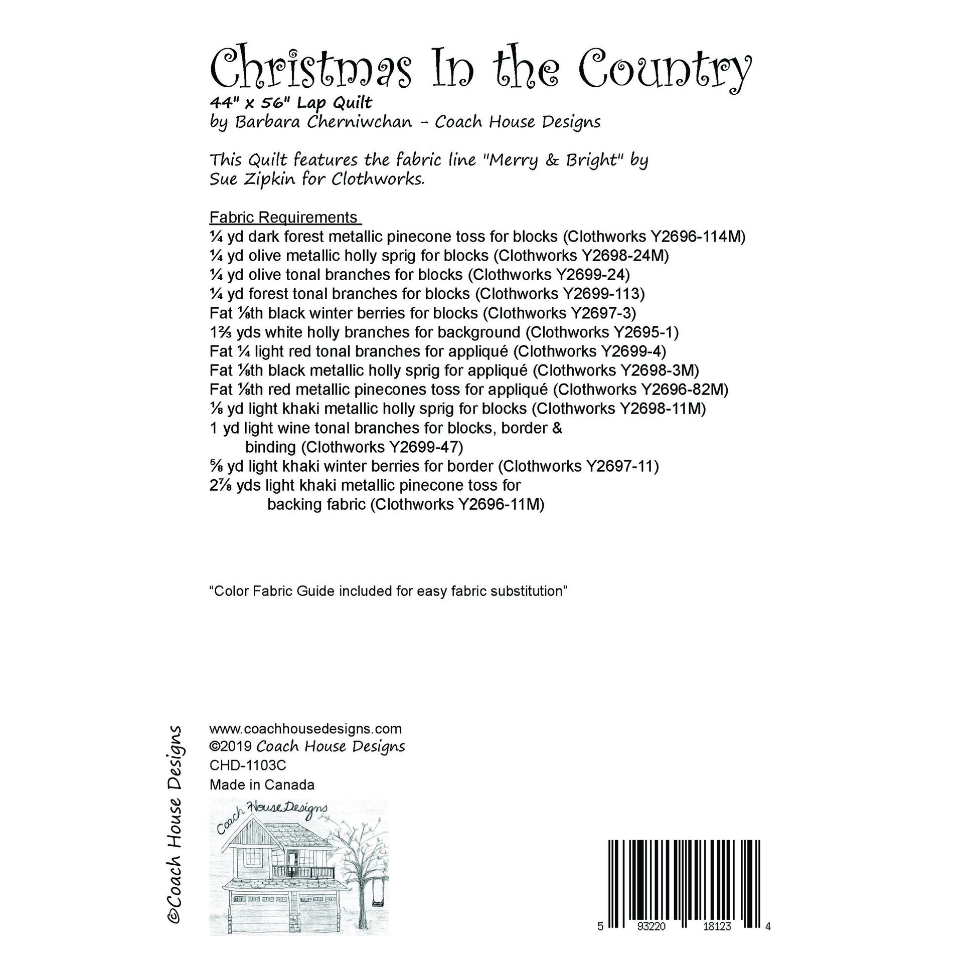 This is one of my favorite Christmas patterns. The quilt measures 44" x 56" so it can be used as a wall quilt or a small lap quilt. It uses simple piecing with just enough applique to make it interesting. This pattern was originally released in 2012 and this is the reissued version with newer fabric from Clothworks. It features Merry & Bright by Sue Zipkin. Pattern is also available as a digital PDF download at a discounted rate.