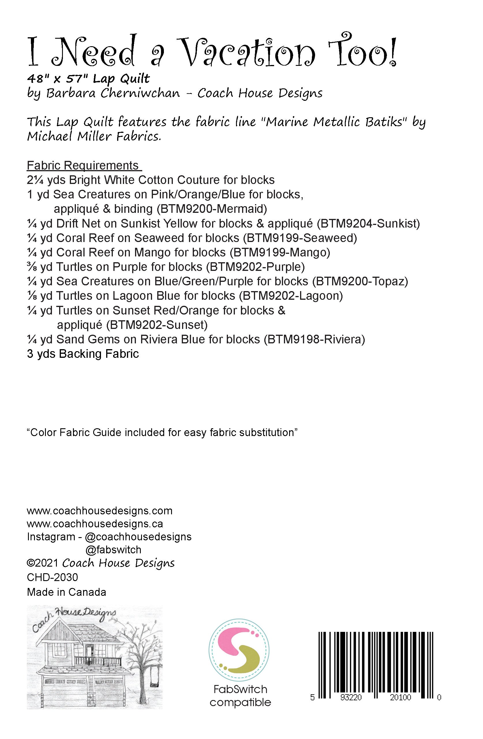 A re-colored version of I Need a Vacation!, this pattern features Marine Metallic Batiks by Michael Miller Fabrics. These fabrics are gorgeous and will be in stores in May 2021. Lap quilt measures 48" x 57".