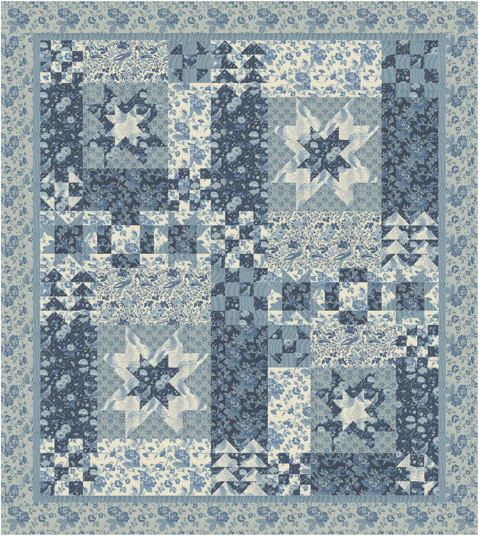 This 66" x 74" lap quilt features the fabric line "Bleu de France" by French General for Moda. The design is reminiscent of a blended quilt where one fabric flows into the other. It is a perfect setting for these gorgeous fabrics.