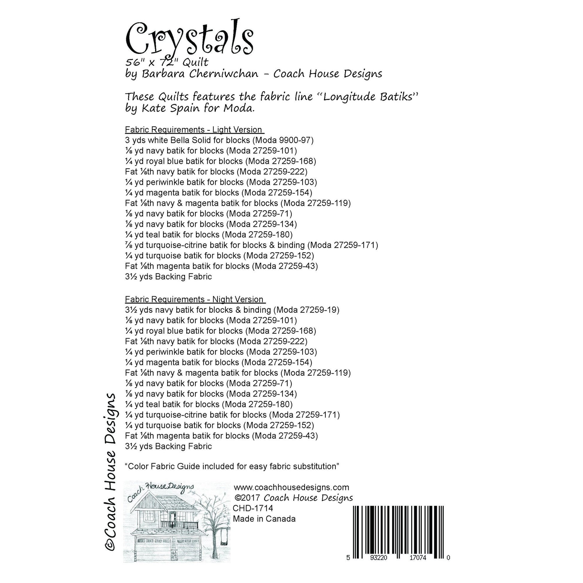 This 56" x 72" lap quilt pattern features "Longitude Batiks" by Kate Spain for Moda and has a "Light" and "Night" option to showcase Kate’s beautiful Batiks. Simple piecing and no applique this pattern could be used to showcase your favorite prints.