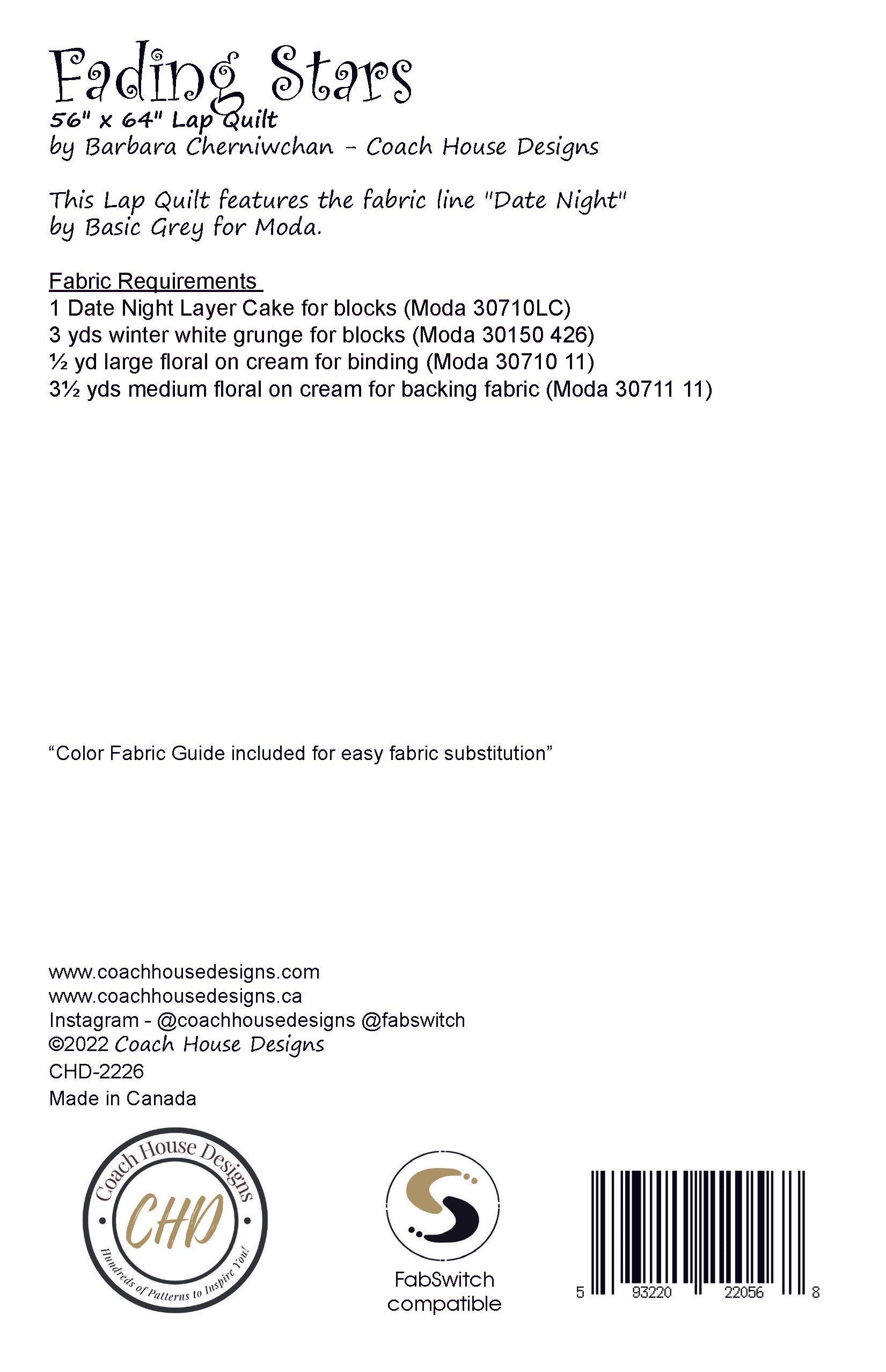 This pattern is FabSwitch compatible. FabSwitch is my free app which allows you to switch out the fabrics in the original design with current fabrics preloaded in the app or with fabrics that you load yourself. You can then print out a revised picture with an updated fabric requirements list. Check out my demo video on the home page. The app is found online at app.fabswitch.com.
