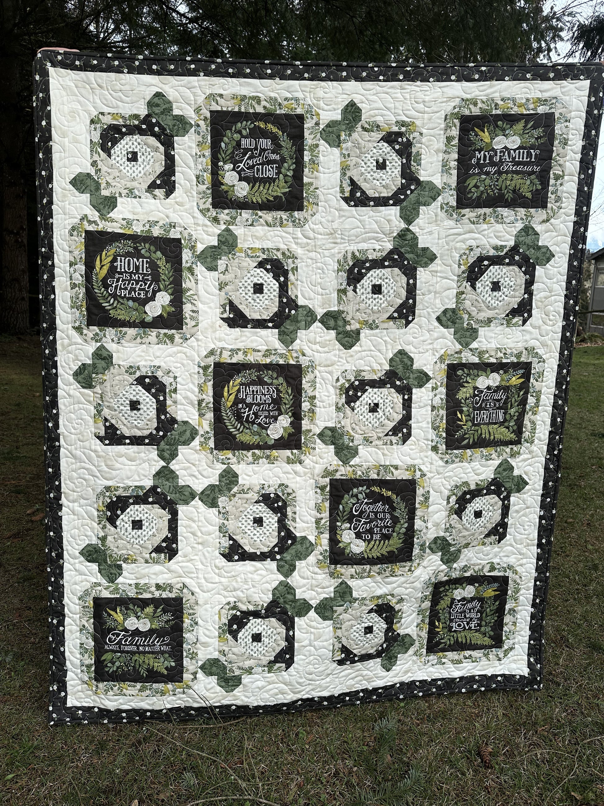This 54" x 66" lap quilt features the fabric line "Happiness Blooms" by Deb Strain for Moda. The pattern uses the slate panel from the group. The framed panel blocks are surrounded by pieced flowers. The neutral colors create a modern look.