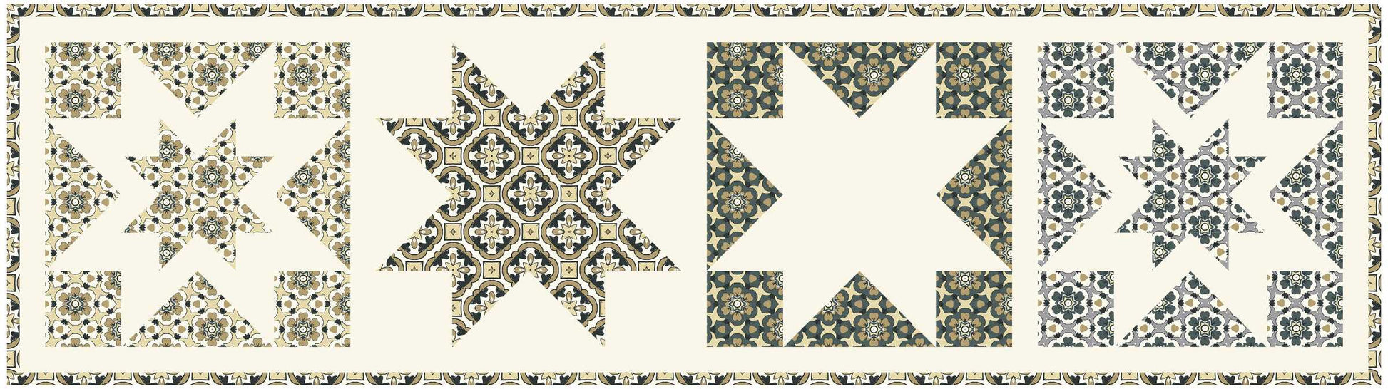 Quick and easy 53" x 14" star table runner featuring Modern Farmhouse fabrics by Barb Cherniwchan. Traditional pattern with a modern vibe. Kit includes fabric for the top and binding. Only a few are available so don't delay.