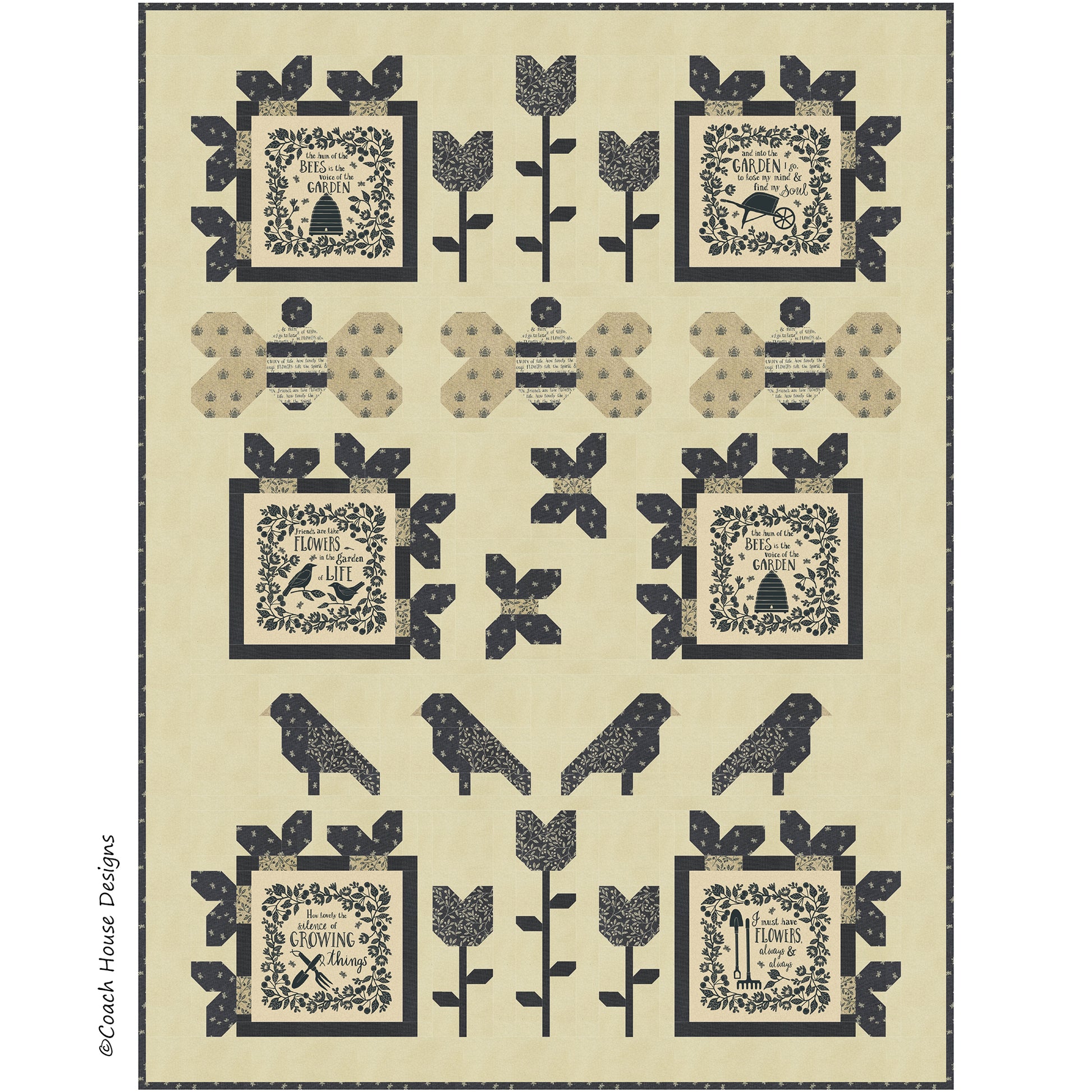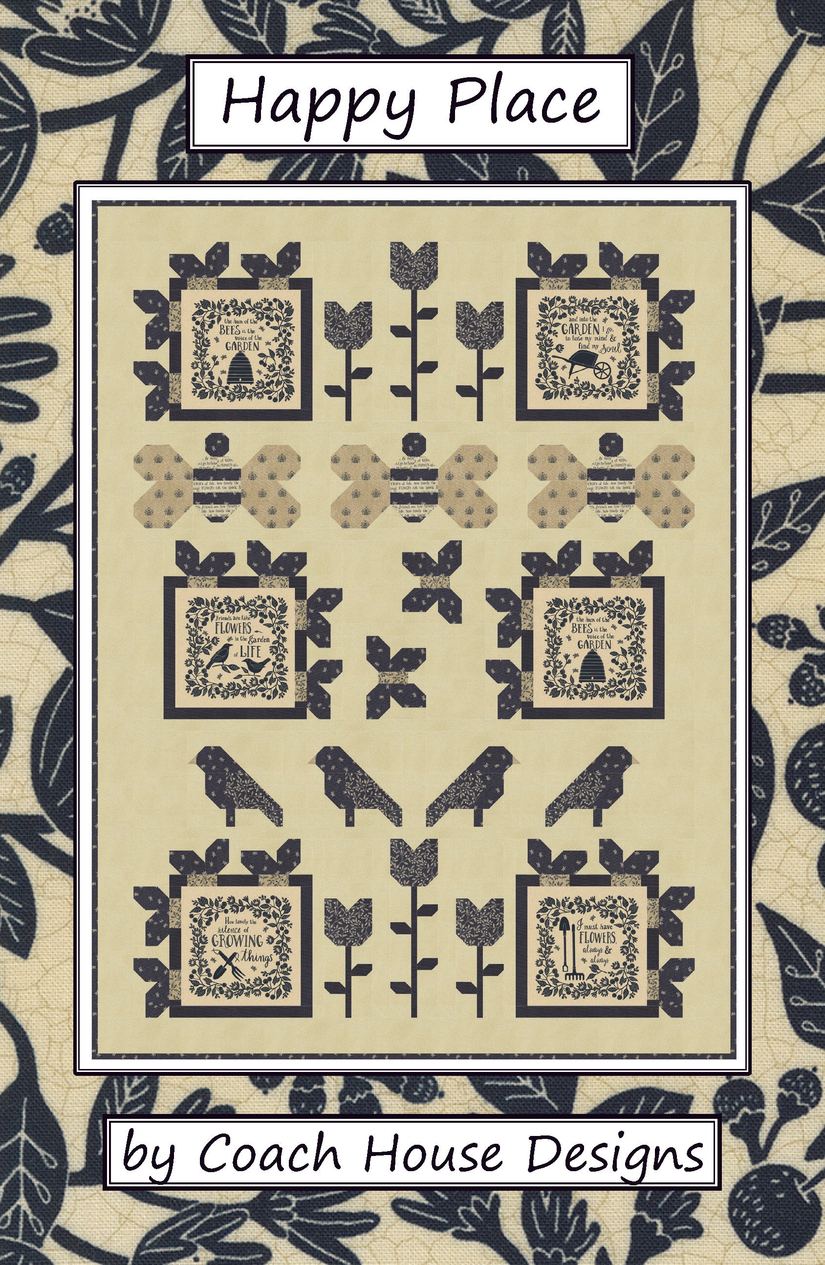 My newest quilt pattern "Happy Place" is inspired by the fabric line "Bloom and Grow" by Kathy Schmitz for Moda Fabrics. Finishing at 53" x 71", this lap quilt uses panels, and the rest is all piecing.