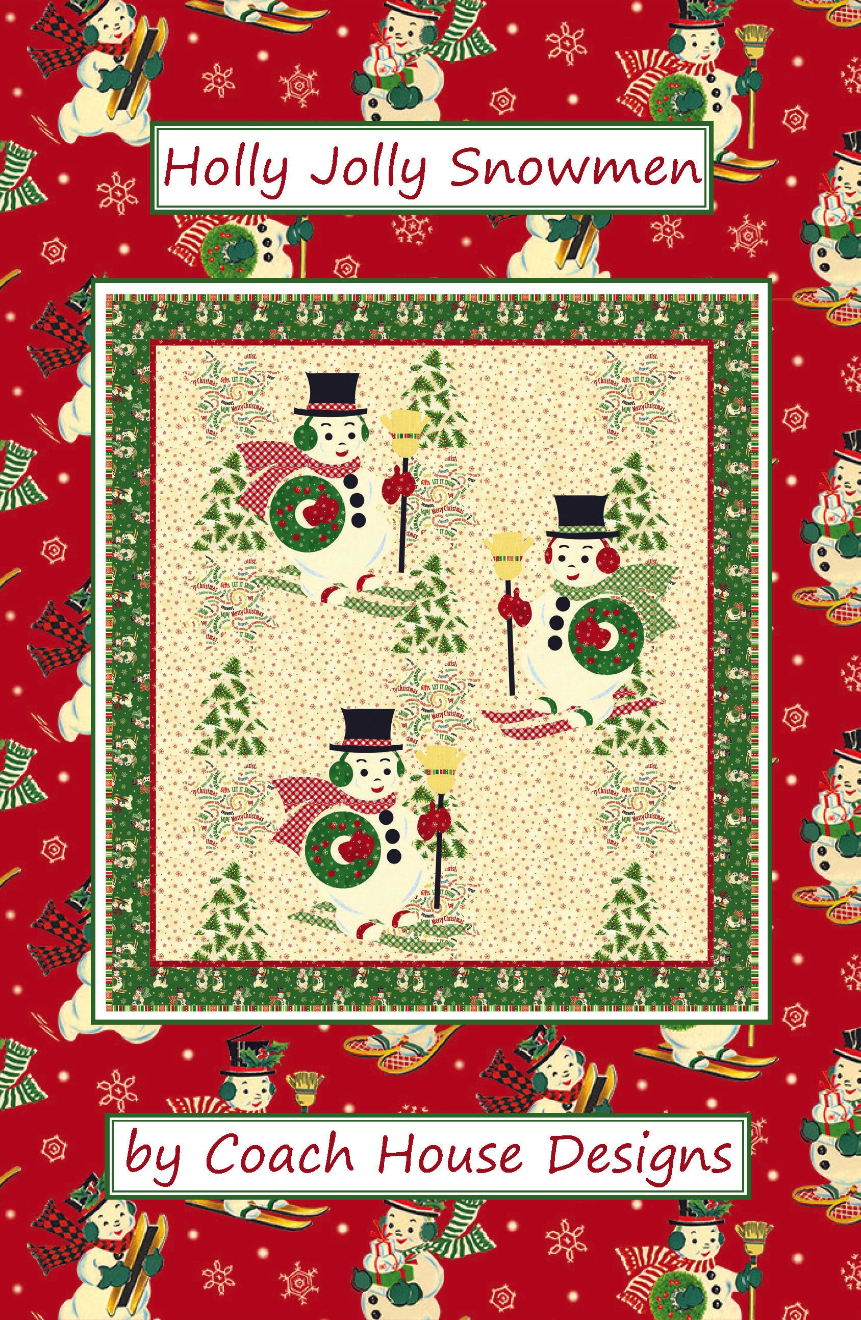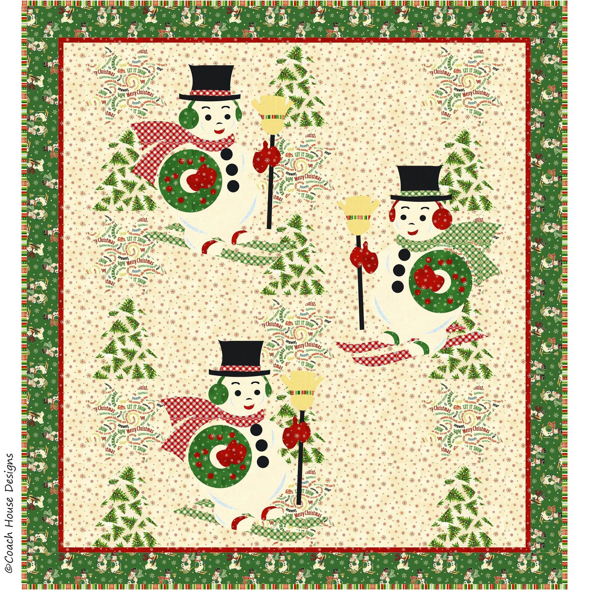 51" x 55" Christmas quilt featuring the fabric line "Vintage Christmas" by Michael Miller Fabrics. This vintage inspired fabric line is so darn cute. You can't help but smile at the jolly skiing snowmen. Pattern features simple piecing, applique and embroidery.
