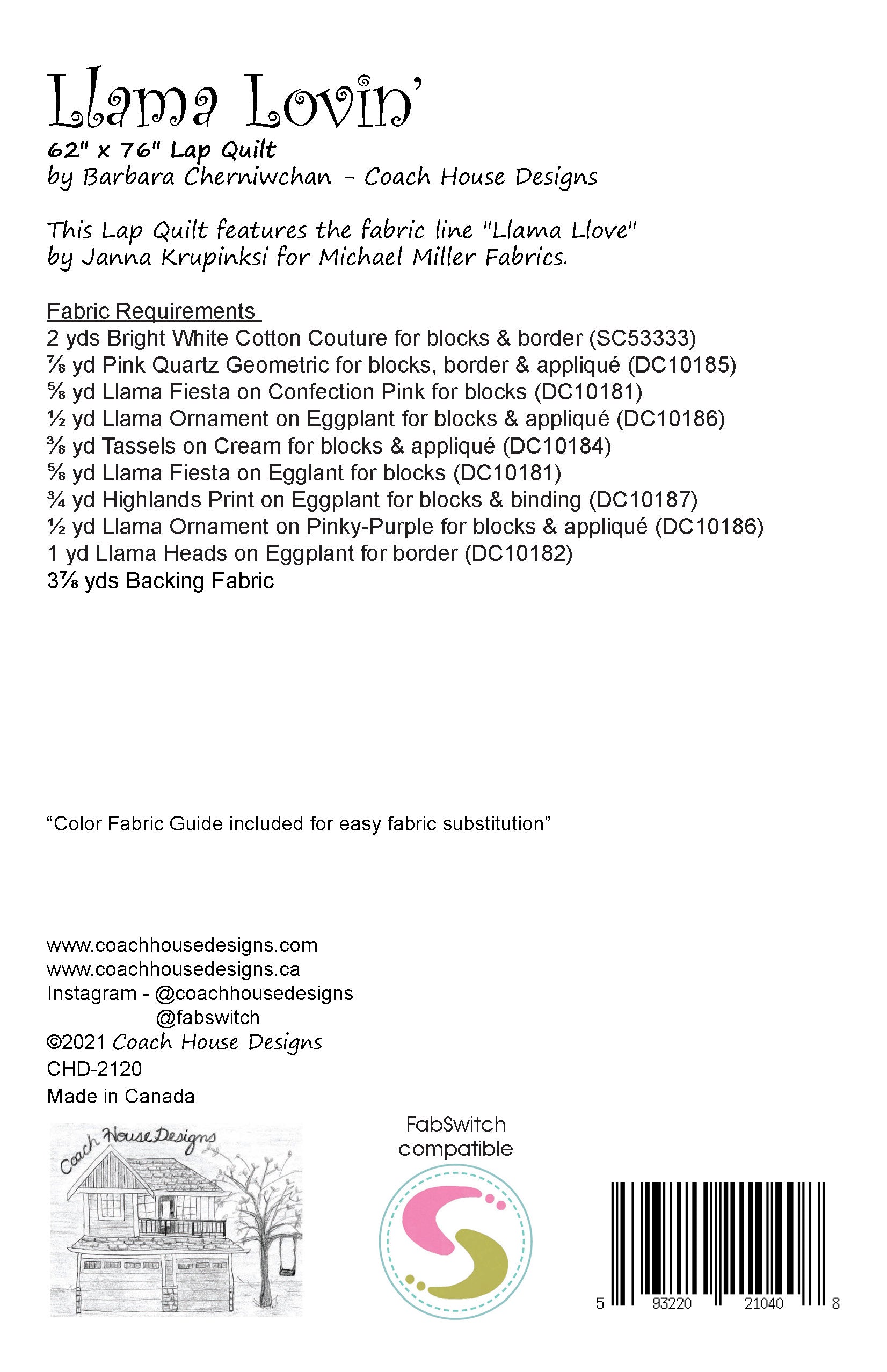 This 62" x 76" lap quilt features the fabric line "Llama Llove" by Janna Krupinksi for Michael Miller Fabrics. The Llamas are all pieced with applique flowers on their adorable heads. The pattern is available now and this super cute fabric will be available in stores January 2022.