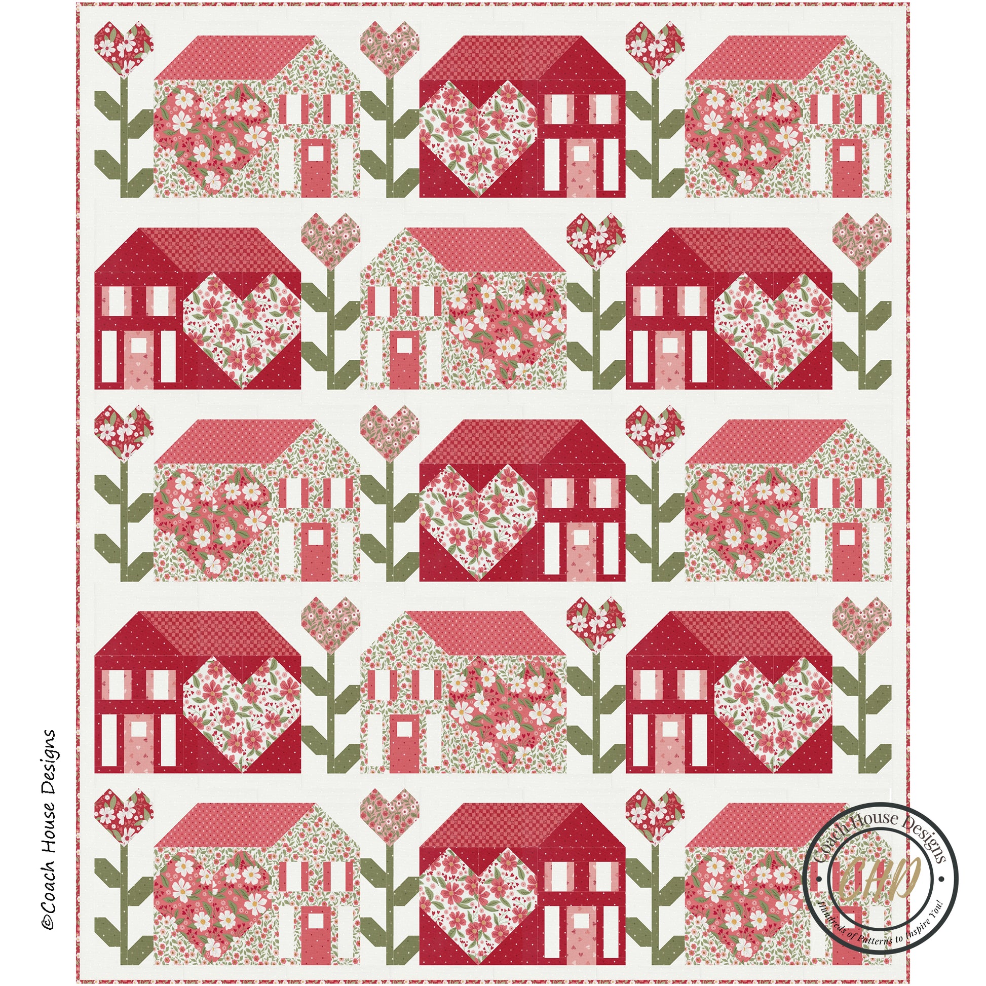 Love Blooms at Home is a delightful quilt pattern that brings together cozy salt box houses and whimsical heart elements in one charming design. Imagine adorable little houses nestled among heart-shaped flowers and scattered heart motifs—it's the perfect blend of home sweet home and romance! This playful pattern invites quilters to create something truly special, whether you're stitching up a gift for someone you love or treating yourself to a project that makes you smile. With its mix of architectural charm and floral sweetness, this pattern captures the joy of creating something meaningful. Perfect for quilters who want their projects to tell a story of love, connection, and the warmth of home.