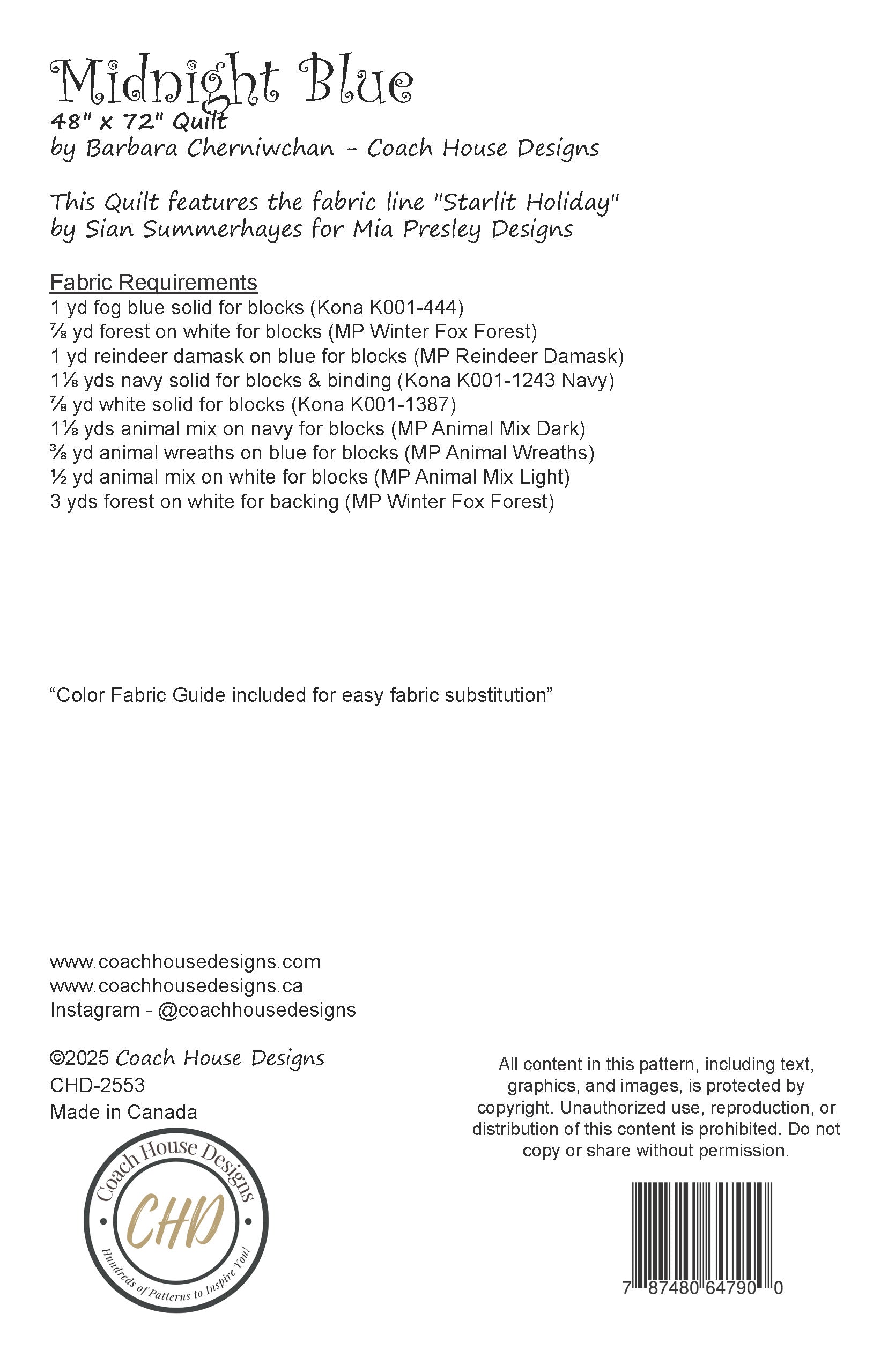 Midnight Blue is brought to life using the Starlit Holiday fabric collection by Sian Summerhayes for Mia Presley Designs. With its serene blues, crisp whites, and shimmering gold accents, the collection evokes the quiet wonder of a snowy evening sky. Modern flora and fauna motifs lend a fresh, urban edge—making this quilt a perfect fit for contemporary spaces and winter-inspired home decor.