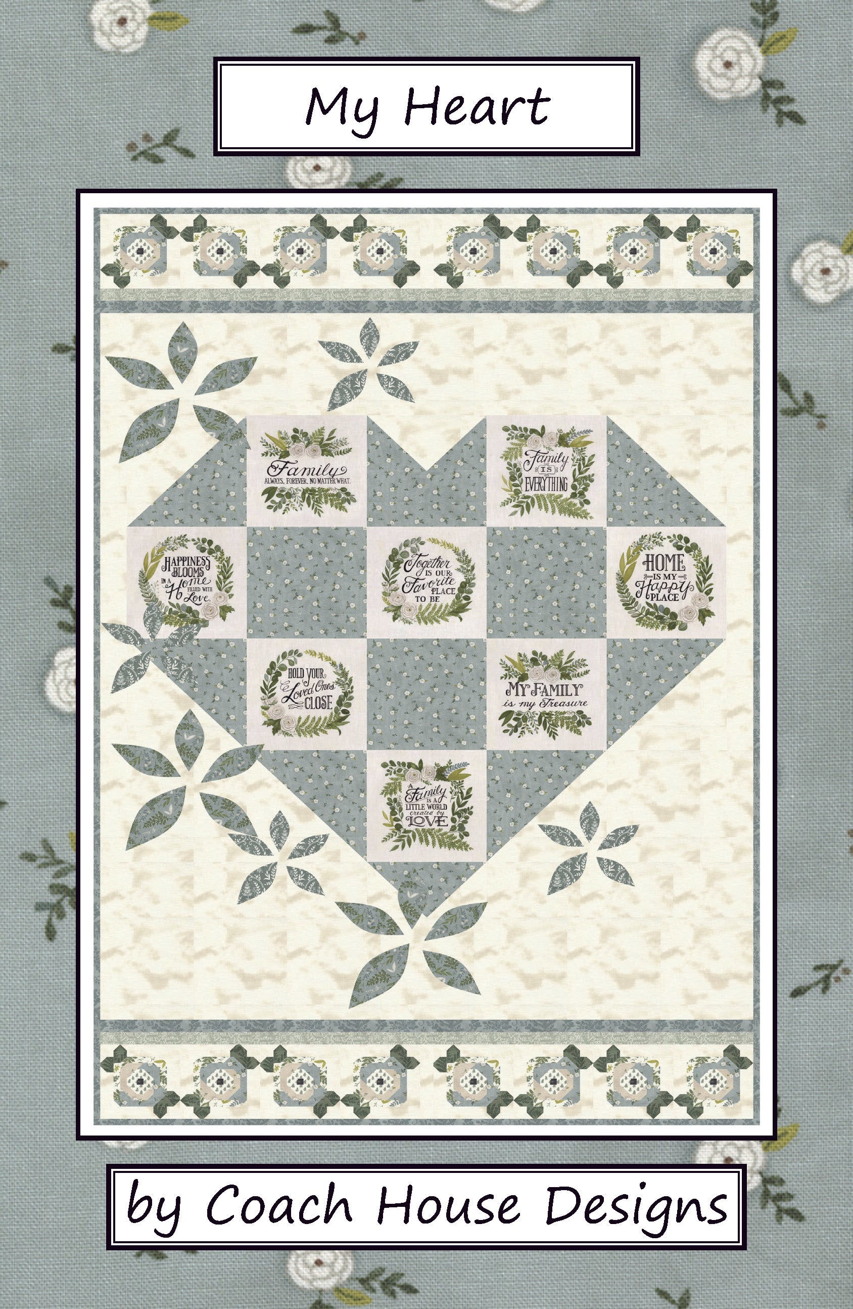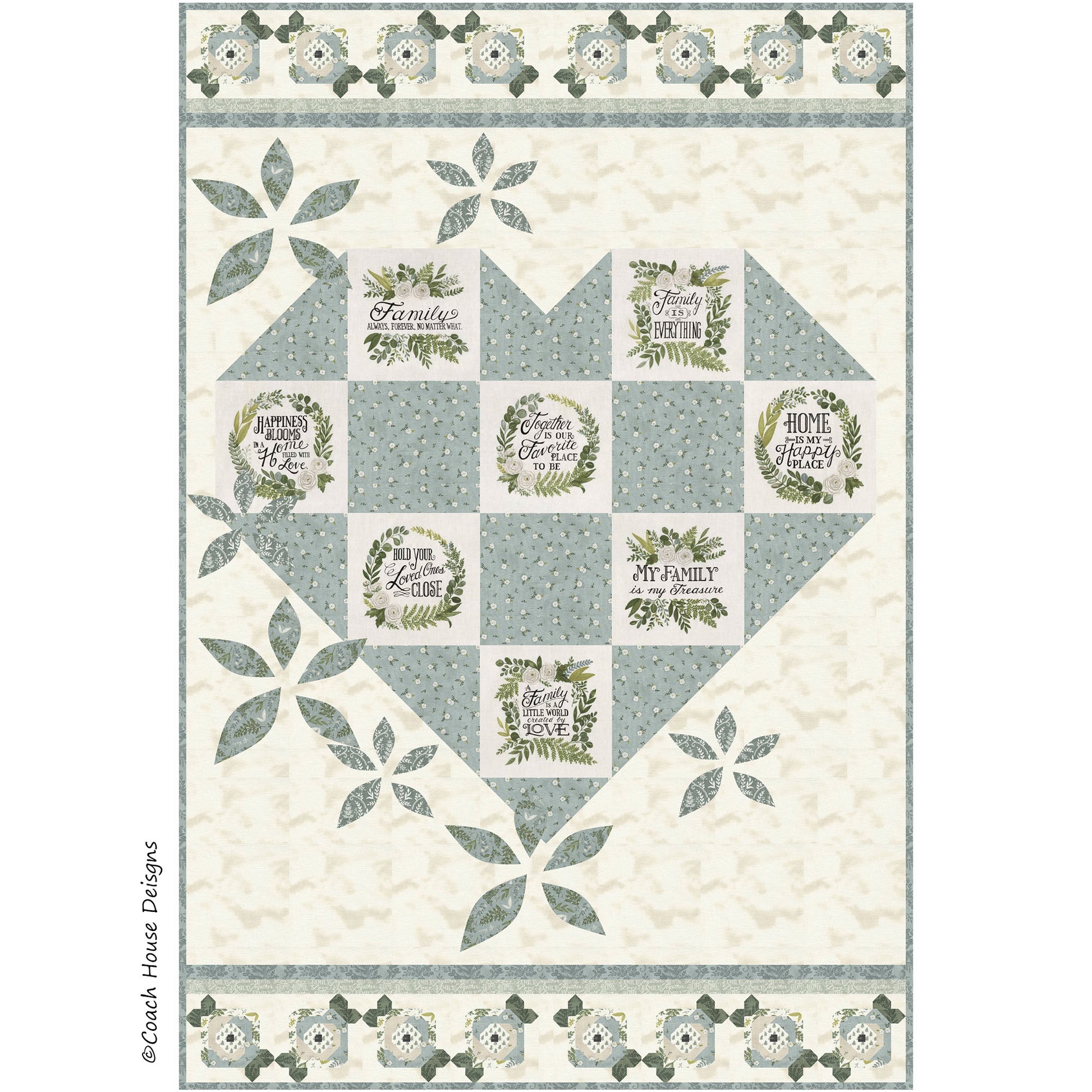 This 49" x 73" lap quilt features the fabric line "Happiness Blooms" by Deb Strain for Moda. The pattern uses the white washed panel from the group with heart-felt family sayings. The flower petals surrounding the center heart are appliqued and the rose blocks at the top and bottom of the quilt give it that shabby chic feel.