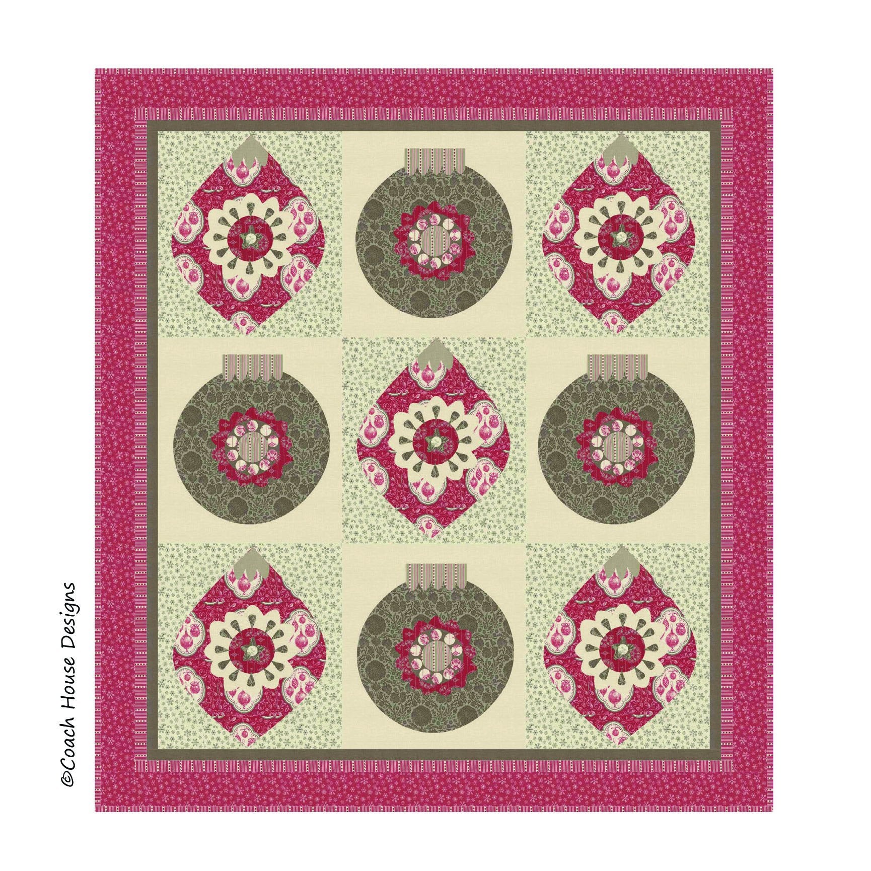 Inspired by vintage ornaments, this lap quilt (58" x 64") features large applique and the fabric line "Joyeux Noel" by French General. I love the soft vintage colors but it would look beautiful in any Christmas fabric.