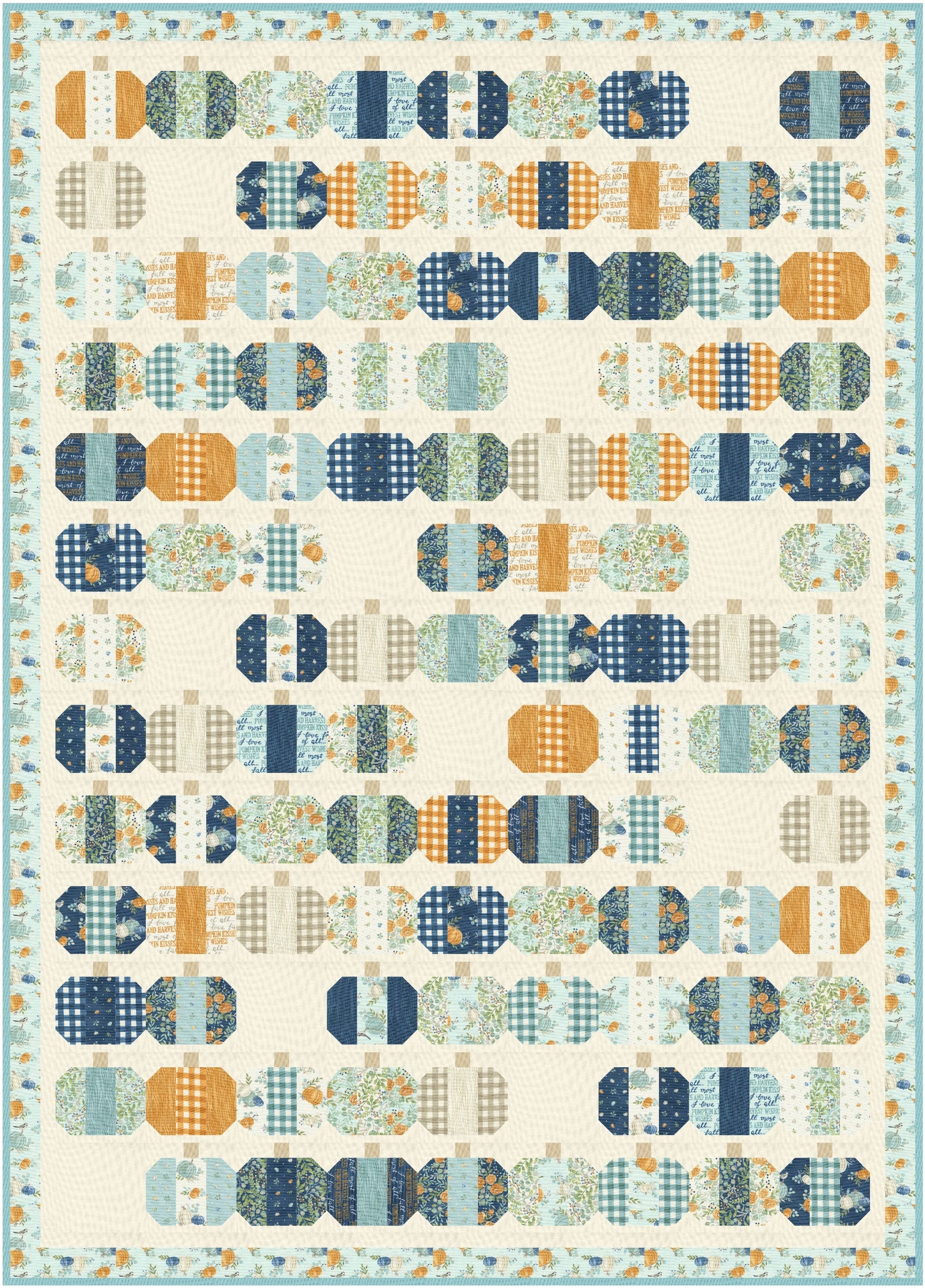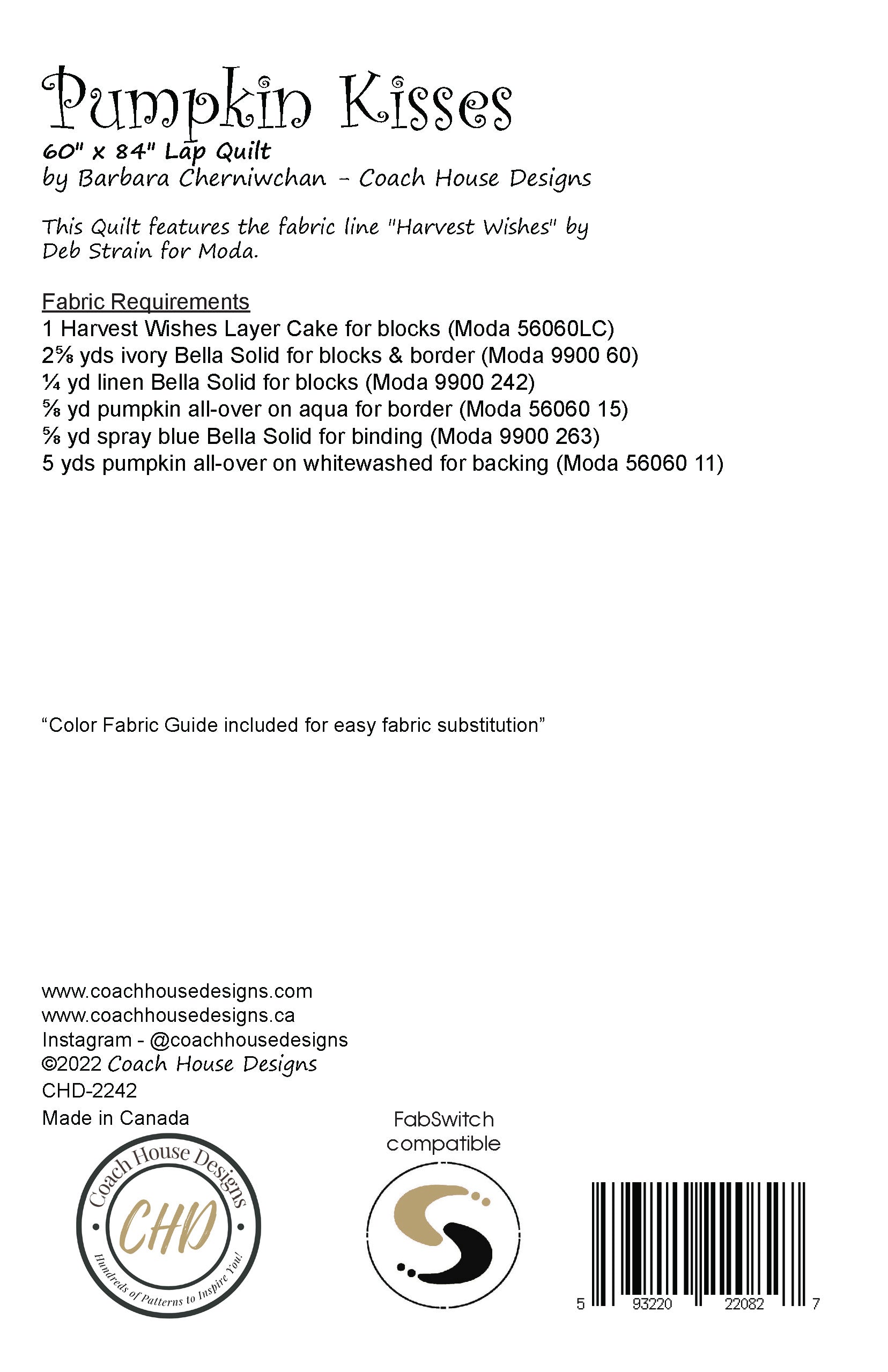 Pumpkins, Pumpkins, Pumpkins! This 60" x 84" large lap quilt uses a Layer Cake (42 - 10" squares) from Deb Strain's upcoming fall fabric line "Harvest Wishes". Easy piecing. Fabric will be available in April 2023 and the pattern is available now.