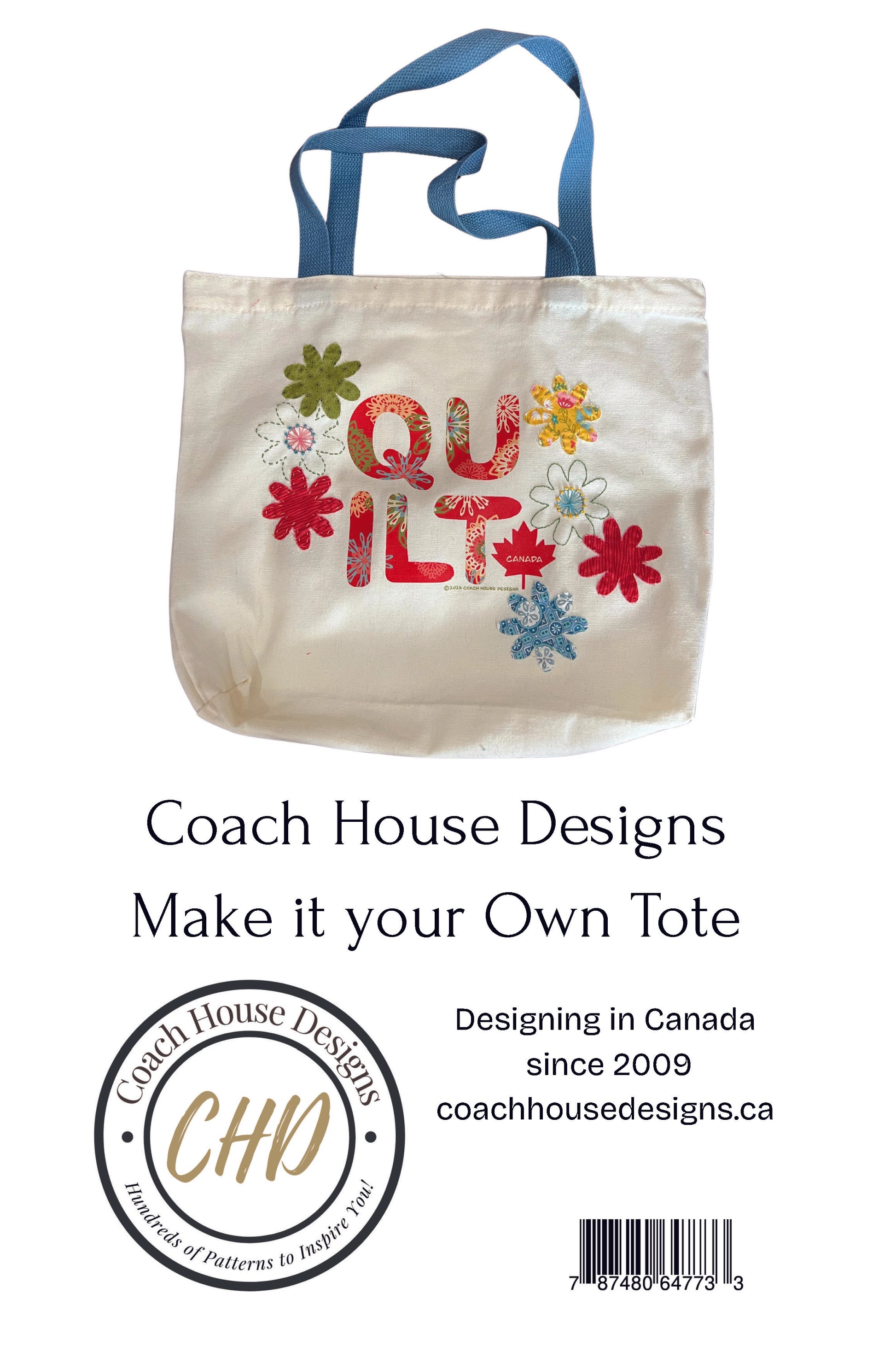 This 12" x 16" Canvas tote bag features lake blue handles and a "Quilt" Logo and Canada Maple Leaf designed by Coach House Designs. It's a perfect shopping bag for trips to your local quilt shop or quilt show. Use it to store finished blocks for your current work in progress. Tote also includes a pattern to "Make it Your Own" as shown in the embellished version.