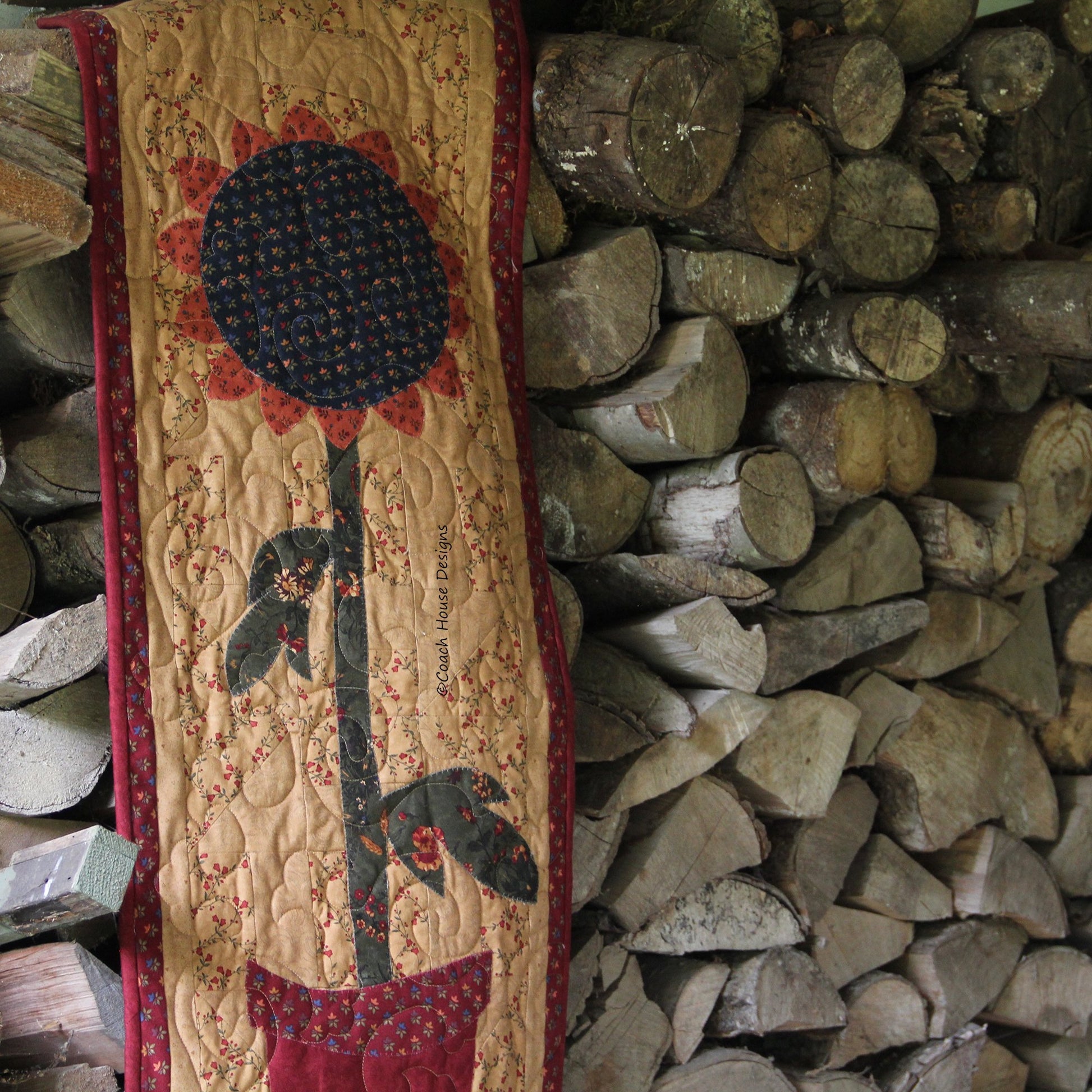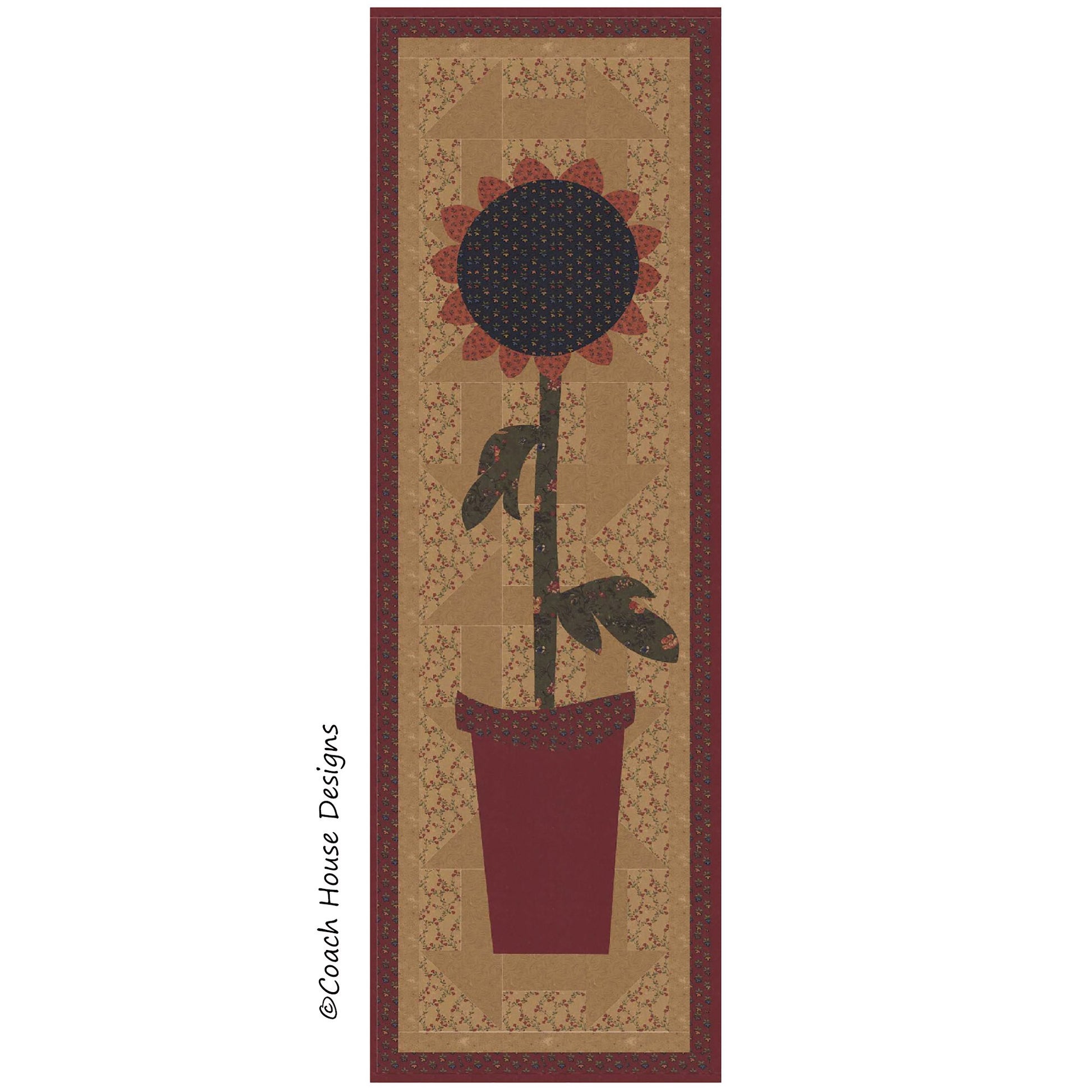 Sunflower table runner (16" x 52") featuring "Sunflower Song" by Kansas Troubles Quilters. This table runner would look cute in any fabric and you can use FabSwitch to see the possibilities.