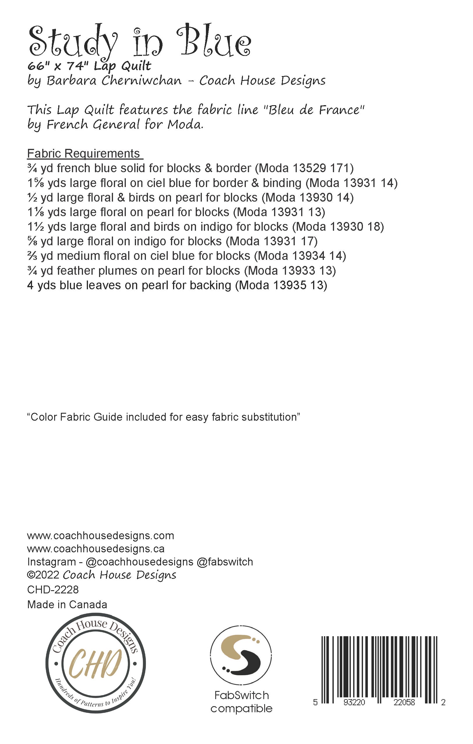 This pattern is FabSwitch compatible. FabSwitch is my free app which allows you to switch out the fabrics in the original design with current fabrics preloaded in the app or with fabrics that you load yourself. You can then print out a revised picture with an updated fabric requirements list. Check out my demo video on the home page. The app is found online at app.fabswitch.com.