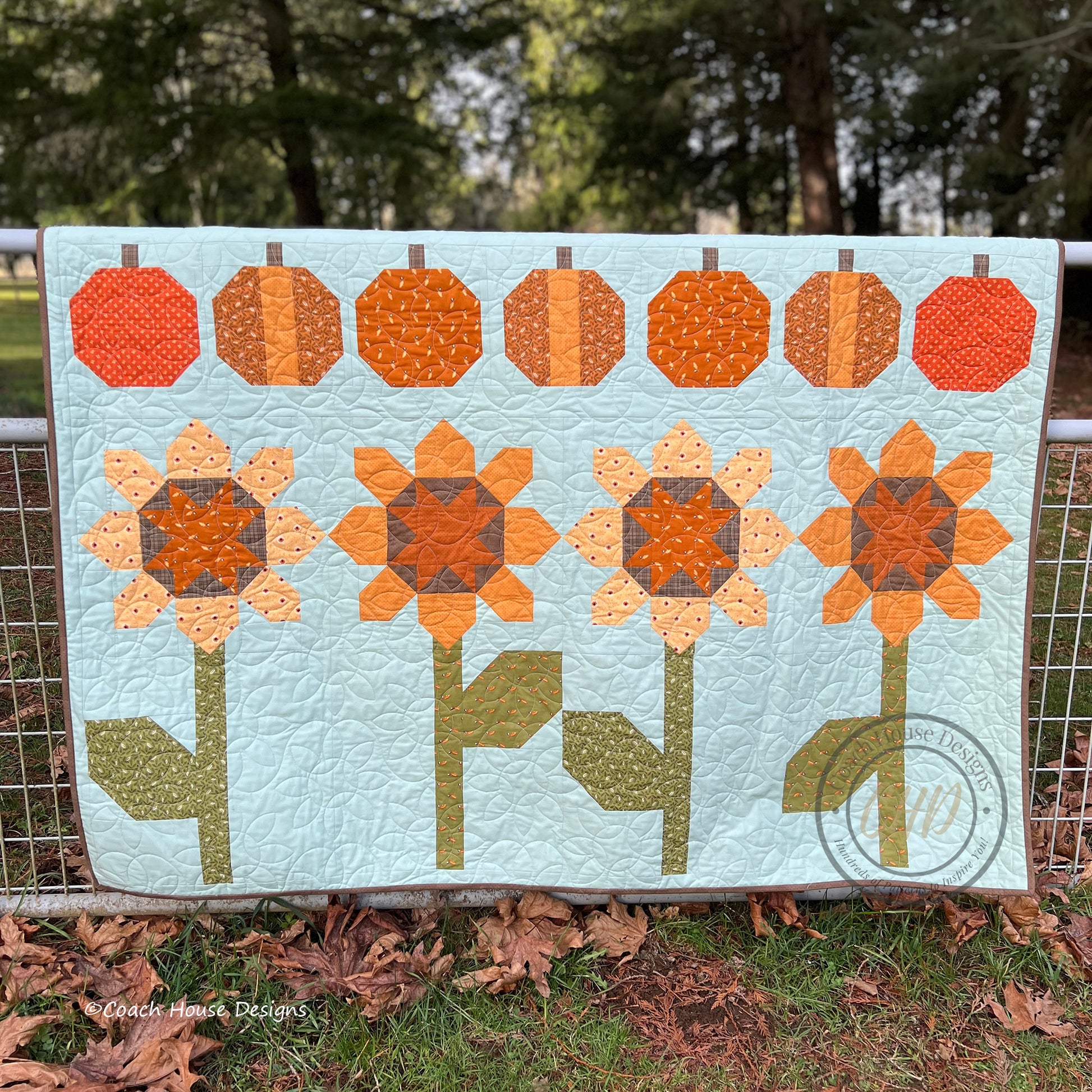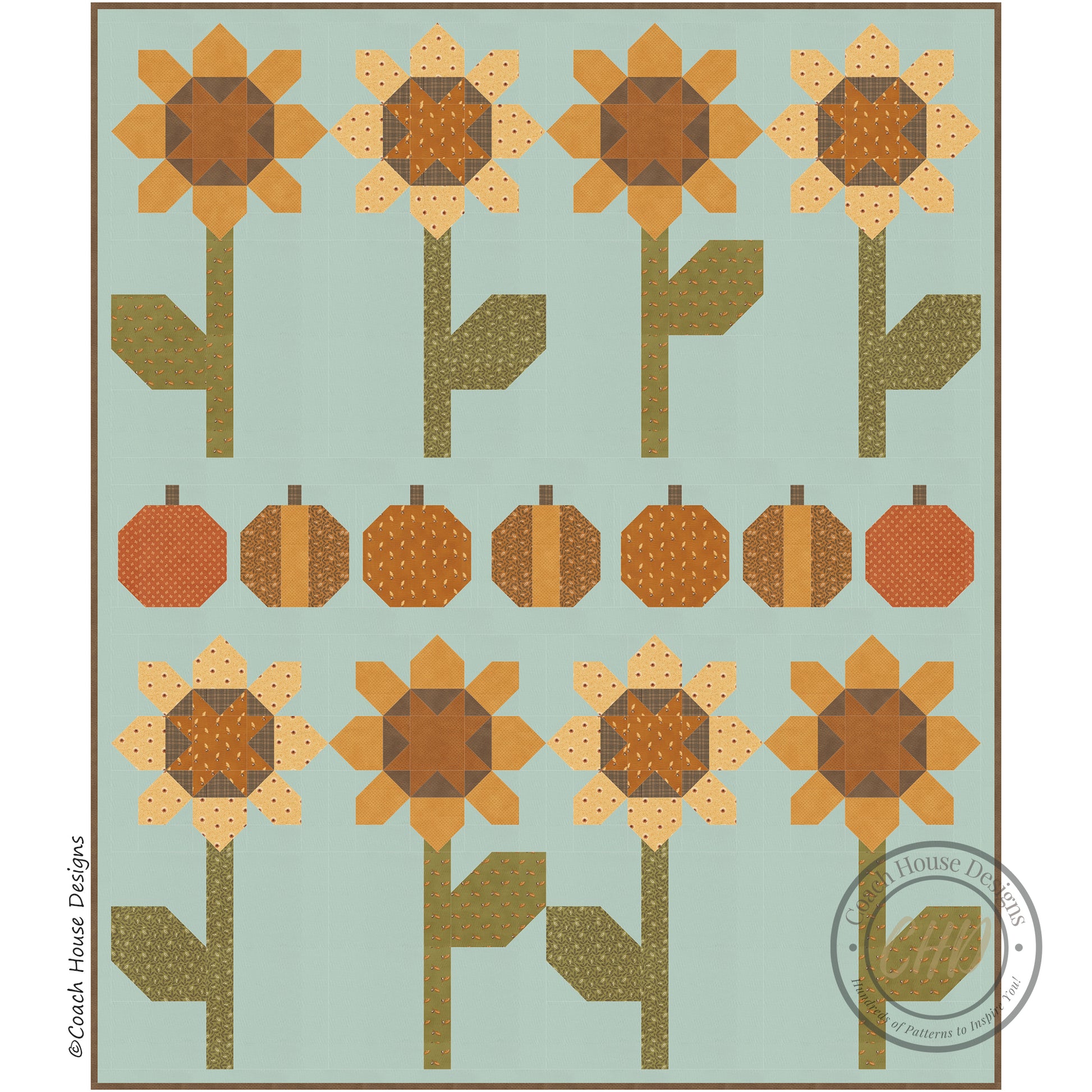 Transition your summer decor into fall with my latest quilt pattern "Sunflower Field". Piece these plush pumpkins and bright sunflowers blocks using yardage from the "Pumpkin Spice Gatherings" fabric collection by Primitive Gatherings for Moda. The quilt finishes at 66" x 79" and is sure to add a touch of fall coziness to your home decor.