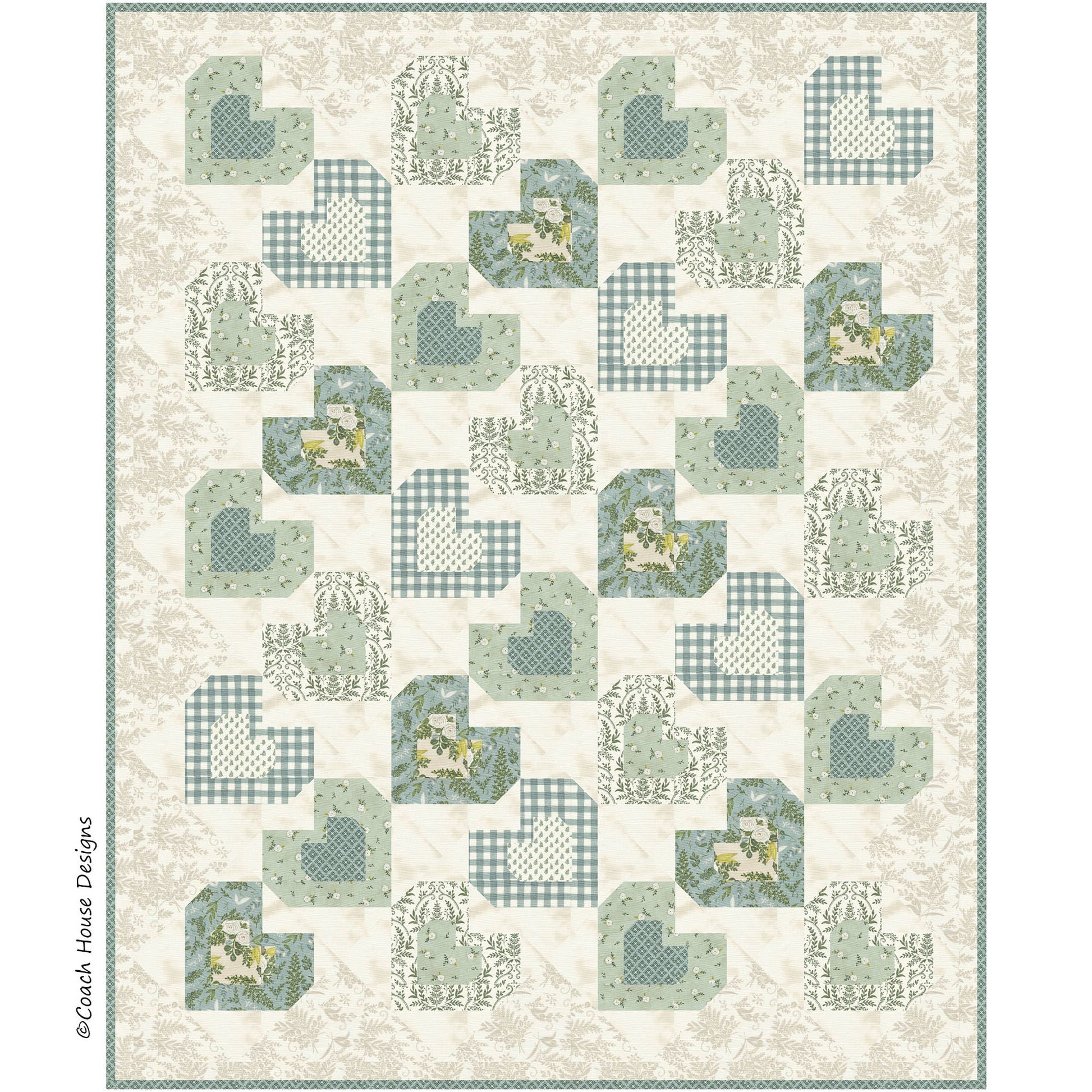 This 47 1/2" x 58 1/2" lap quilt features the fabric line "Happiness Blooms" by Deb Strain for Moda.   The simple double heart block is set on point.  Perfect quilt for engagement or wedding present!